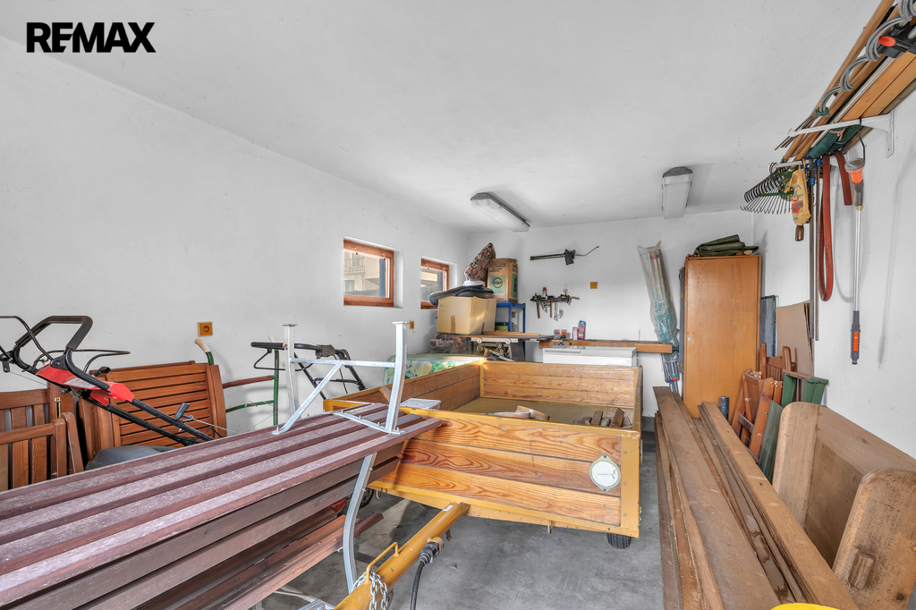 Na zahradě je další garáž s prostorem pro zahradní techniku a dílnu. Tento objekt je částečně podsklepen.