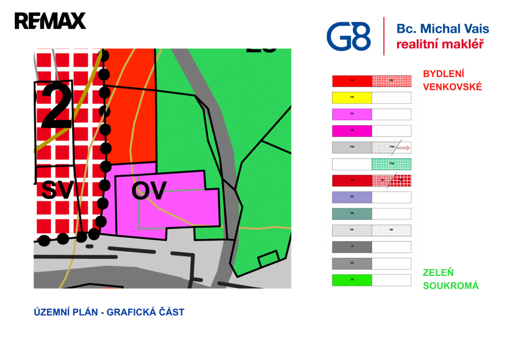 Zbývající část pozemku je vedena jako ZS – zeleň soukromá, tedy plocha vhodná pro zahradu, sad či užitkové pěstování. Tato kombinace dává budoucímu majiteli jasně vymezený stavební prostor a zároveň dostatek místa pro relaxaci, pěstování nebo drobné zahradní stavby související s užíváním pozemku.