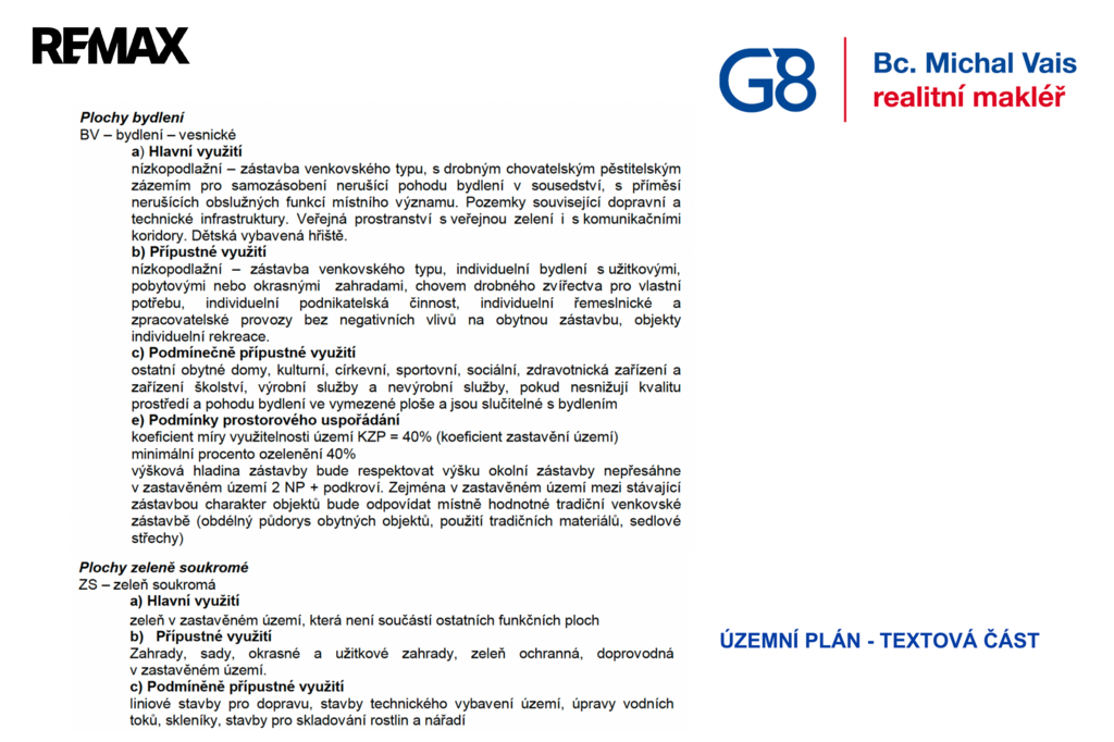 Dle územního plánu je část pozemku určena jako BV – bydlení vesnické, což umožňuje realizaci nízkopodlažní zástavby venkovského typu s maximálně 2 nadzemními podlažími a podkrovím. Koeficient zastavění činí 40 % a minimální podíl zeleně 40 %, což přirozeně podporuje koncept rodinného bydlení s dostatkem zahrady a soukromí. Charakter stavby by měl respektovat tradiční venkovskou architekturu (např. sedlová střecha, obdélný půdorys).