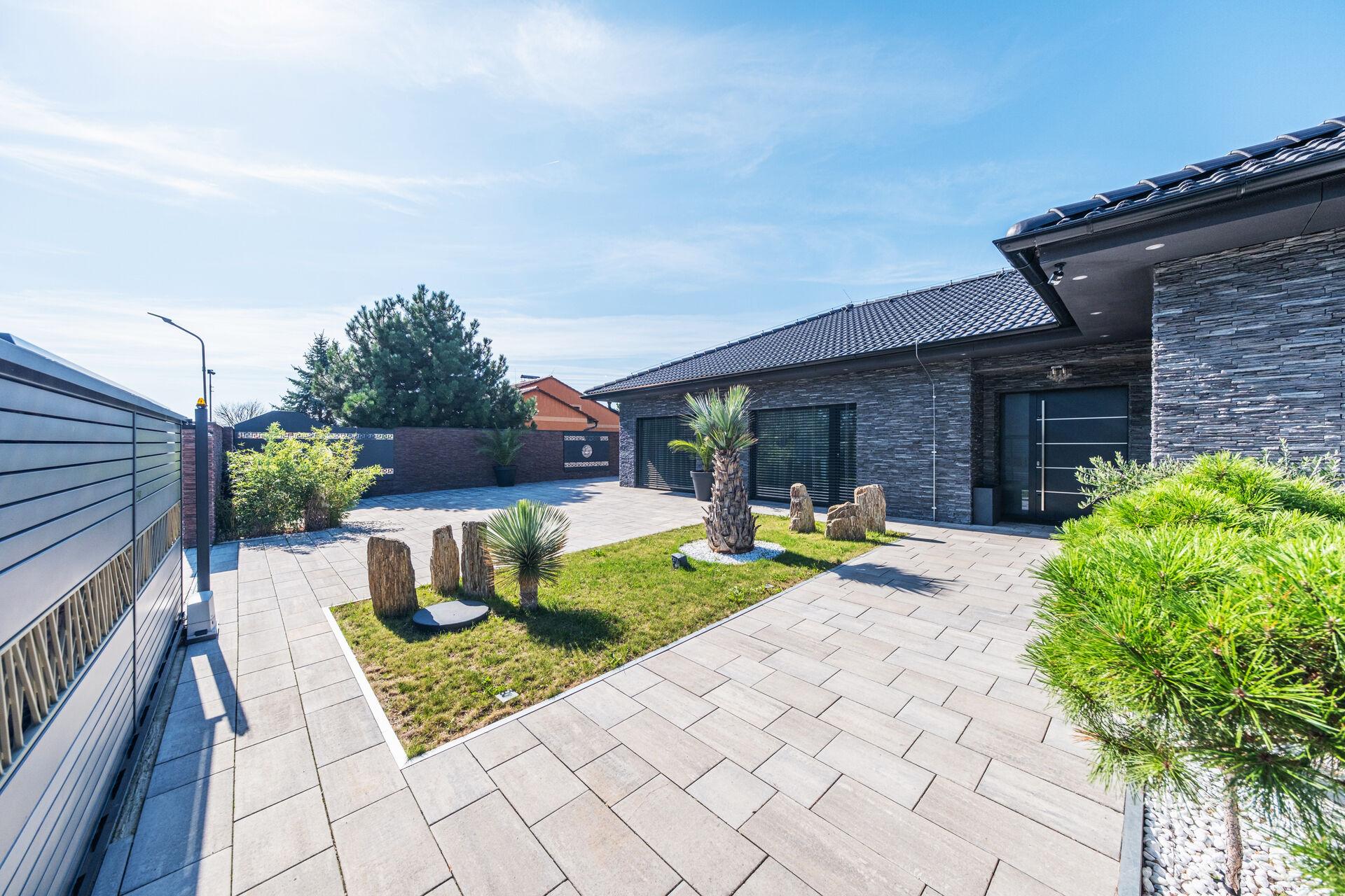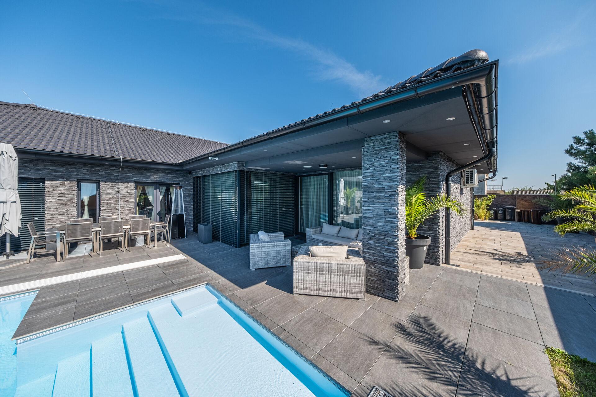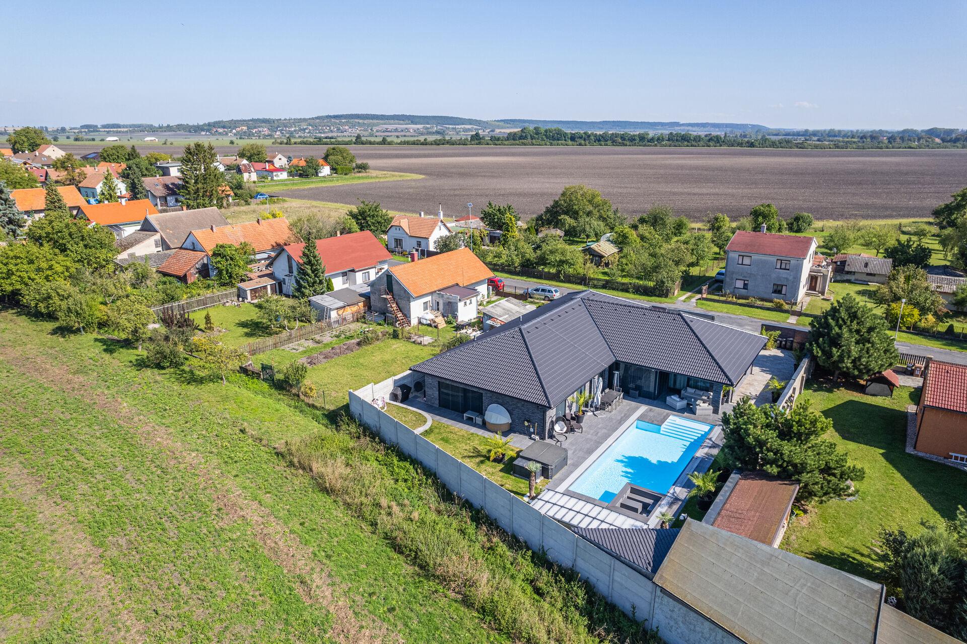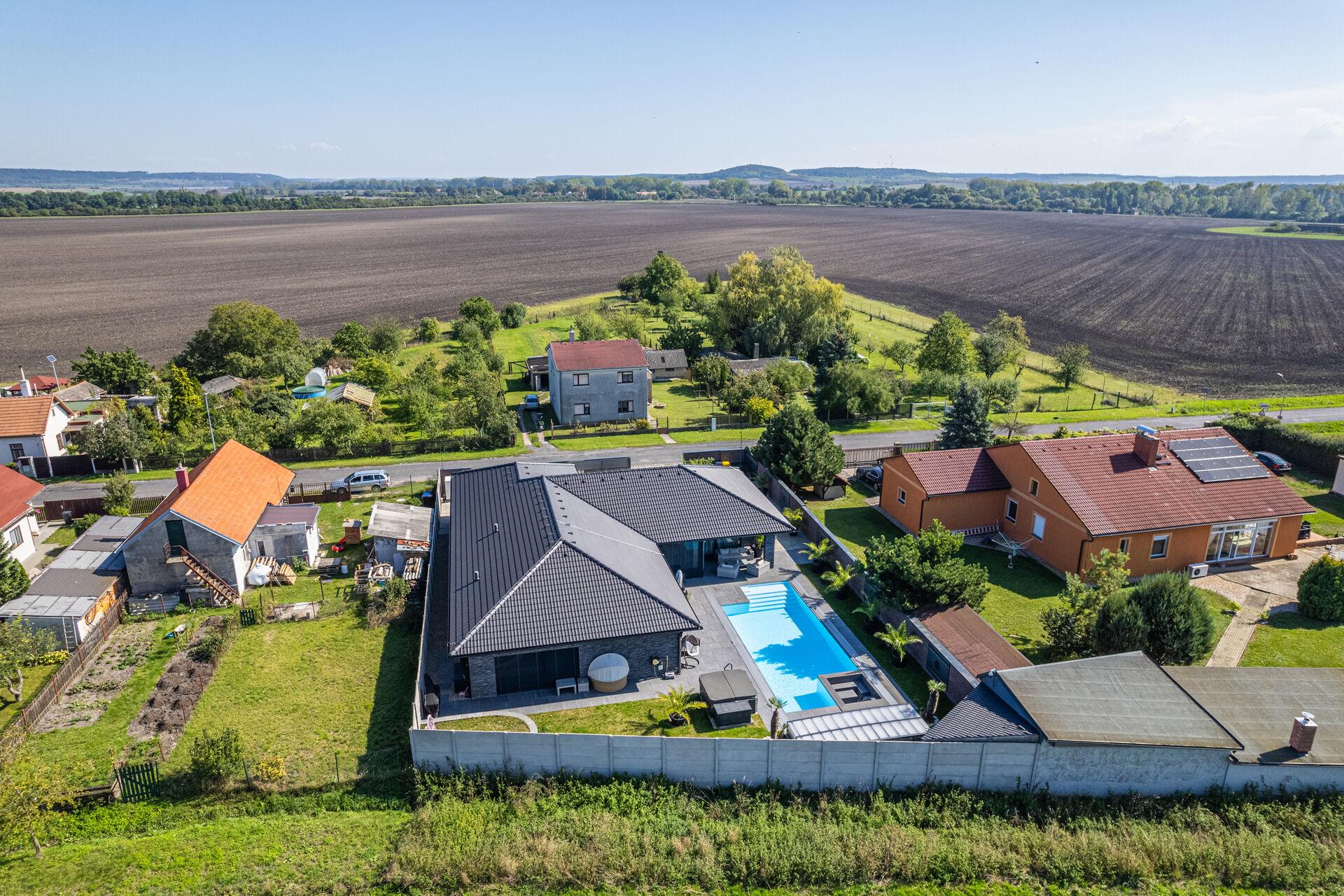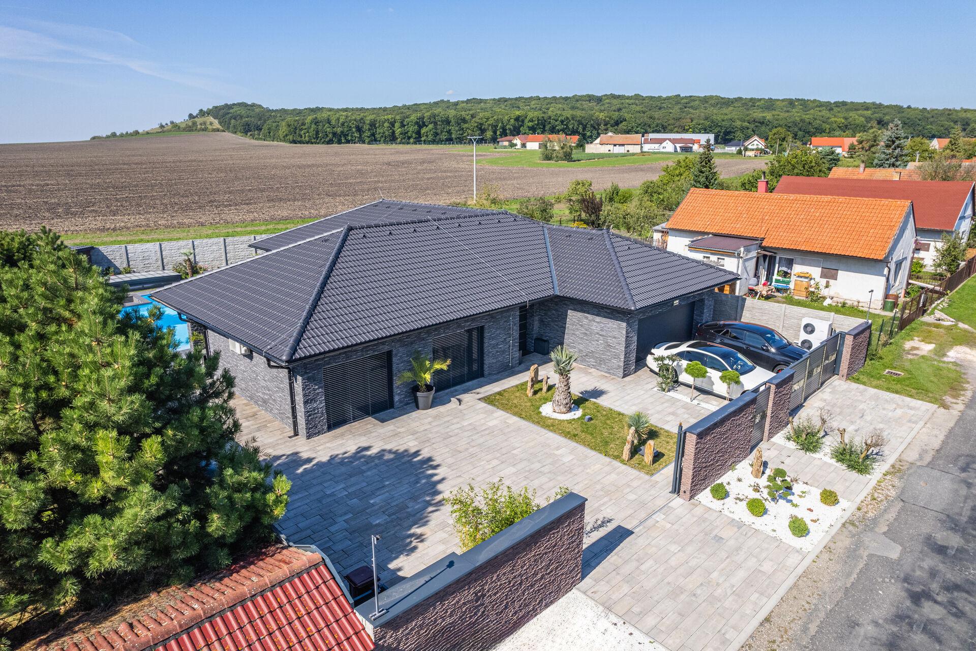 Bungalov o velikosti 6+kk a garáží pro dva automobily a zázemím pro všechny náročné nadšence, kteří chtějí mít v domě svůj vlastní pánský prostor, 11ti metrovým krytým vyhřívaným bazénem, v něm vsazeném sezení, vířivkou pro šest osob a všemi nejmodernějšími technologiemi, které současný trh nabízí, má žitnou plochu 241,3 m² a celkovou zastavěnou plochu krásných 288 m². Dům leží na pozemku o výměře 892 m².