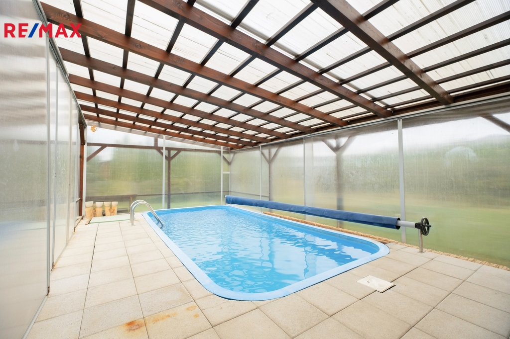 Zděný dům má užitnou plochu 138 m². Dominantou je prostorný obývací pokoj s přímým vstupem na zastřešenou terasu o přibližné velikosti 50 m² nebo ke krytému bazénu o rozměrech 3 × 6 metrů. Bazén se slanou vodou je vyhřívaný tepelným čerpadlem, takže si můžete užít koupání i mimo hlavní sezónu. Tato kombinace vytváří skvělé zázemí pro celoroční relax a soukromí.