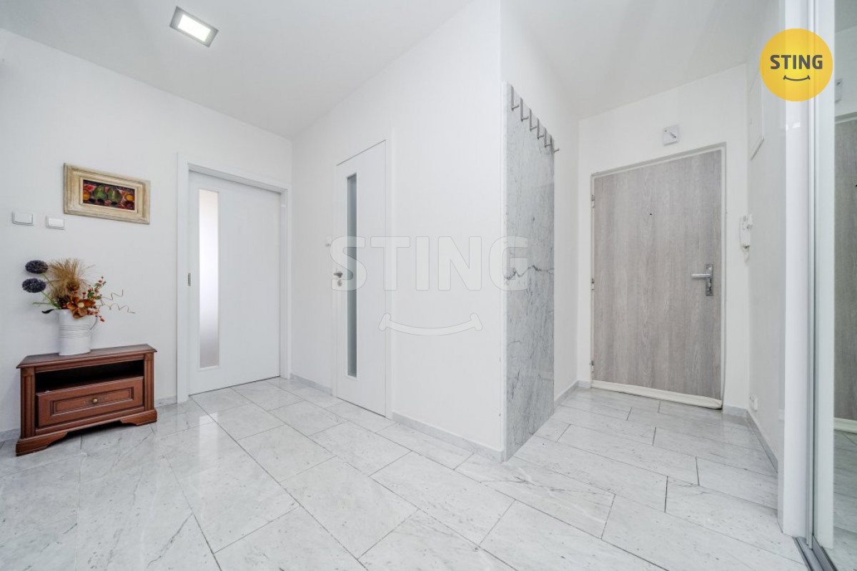Byt prošel rozsáhlou rekonstrukcí před 14 lety, před pěti lety byla instalována nová kuchyňská linka, před 4 lety byly instalována nová okna i dveře. Byt je ve velmi zachovalý a v udržovaném stavu. Obrovskou výhodou jsou neprůchozí pokoje. V prostorné chodbě je důmyslně uschovaná vestavěná skříň ve zdi za zrcadly a zároveň i komora se šatnou. Zrcadla krásně zvětší a podtrhnou vzdušný prostor. Chodbu a obývací pokoj s kuchyňským koutem dělí mohutné skleněné posuvné třídílné dveře, které příjemně doplní interiér jako designový prvek. Kuchyně s kuchyňskou linkou, pracovní deska z mramoru, s vestavěnou lednicí a mrazákem, varnou deskou, elektrickou troubou, digestoří, mikrovlnou troubou, myčkou a pračkou. Koupelna s vanou, umyvadlem a umyvadlovou skříni se zrcadlem, obklady a dlažbou s WC dohromady. Mramor se nachází v celém bytě, jak na podlaze, obkladech, tak i na parapetech i jako designový prvek na stěně.