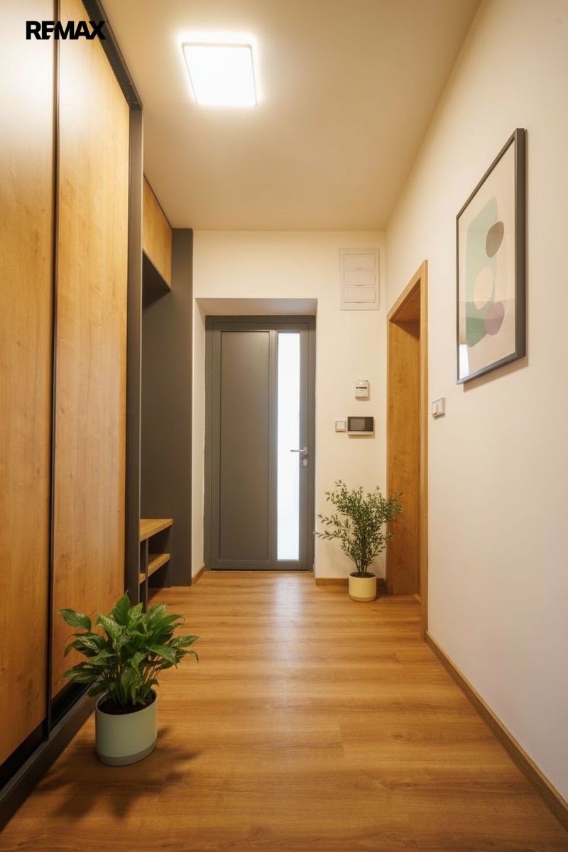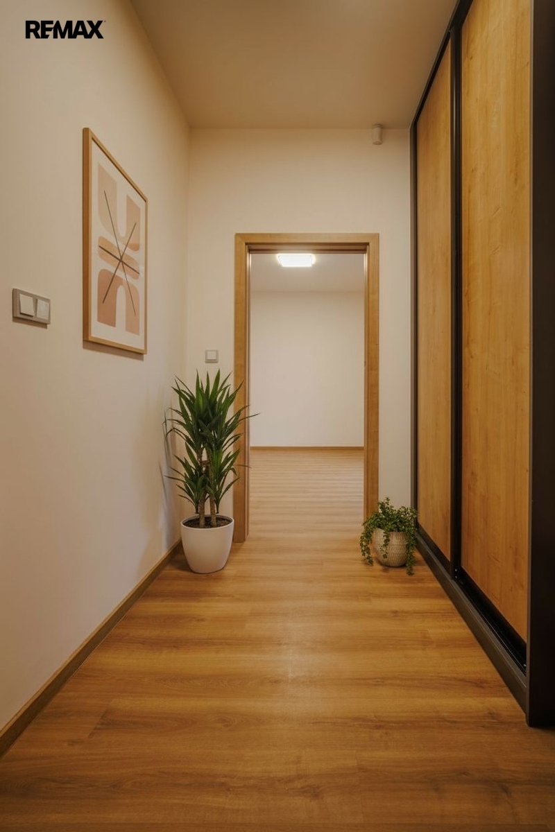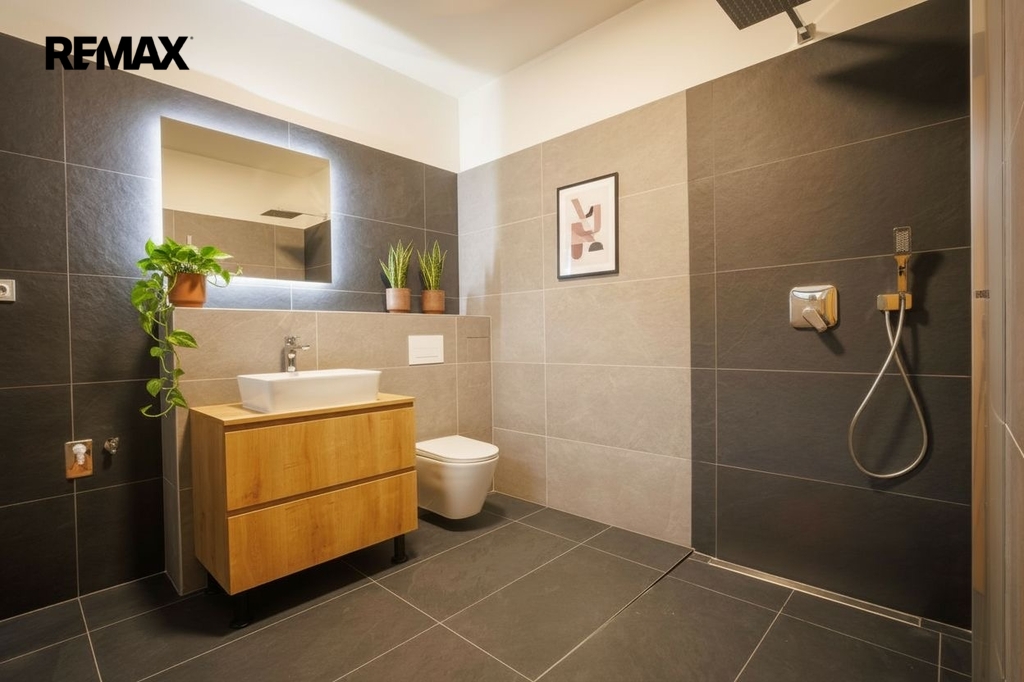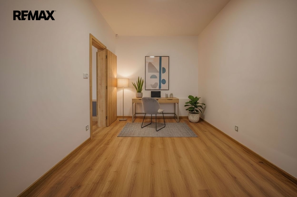 Byt se nachází v 1. NP, má v rámci objektu zcela samostatný vstup a přímo z obývacího prostoru velkoformátový portál směrem na vlastní terasu/zahradu. Dispozice 2+kk, v předsíni zabudovány velmi dobře řešené vestavné skříně, koupelna má příjemných 7 m2, nadstandardní až velkorysá kuchyňská linka s vestavnými spotřebiči, samostatná ložnice, velmi komfortní podlahové vytápění. Vše vybudováno nově, právě vy tedy můžete být prvními obyvateli. Byt se pronajímá nezařízený, nábytek na fotografiích je pouze dekorativní.