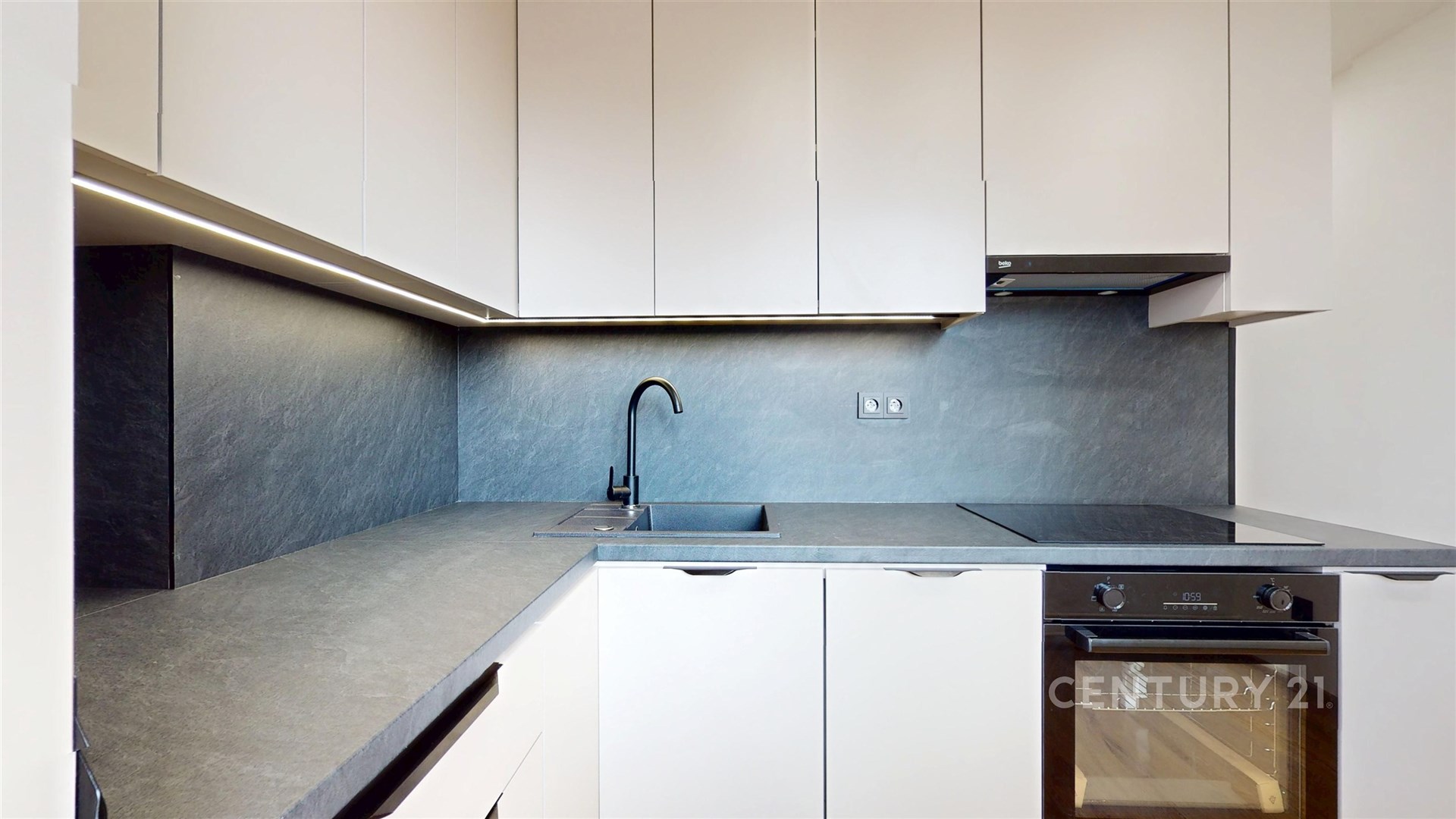 Srdcem domova je nová, prosvětlená kuchyně s vestavnými spotřebiči a elegantním podsvícením, která uspokojí i ty nejnáročnější kuchaře.