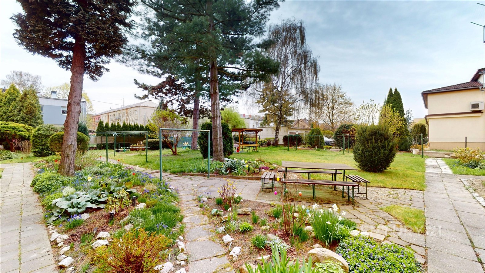 K domu náleží společná, kompletně oplocená zahrada, která vás potěší i dřevěnou zastřešenou pergolou.