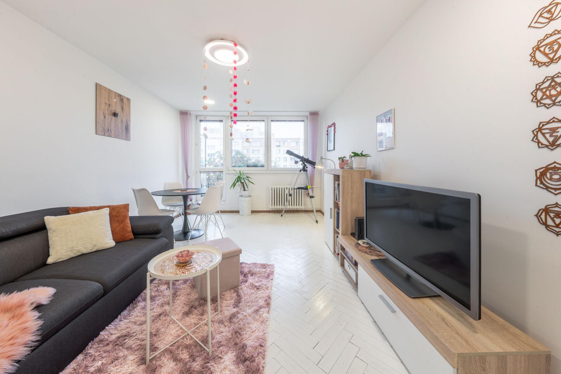 Byt nabízí velmi praktické uspořádání. Dva pokoje: jeden prostornější s balkónem, vhodný jako obývací pokoj a druhý pokoj, který je vhodný jako ložnice nebo pracovna, přičemž v obytných místnostech byly citlivě zrenovovány původní dřevěné parkety, které dodávají interiéru jedinečnou atmosféru. V ostatních částech bytu je položena moderní a odolná vinylová podlaha.
