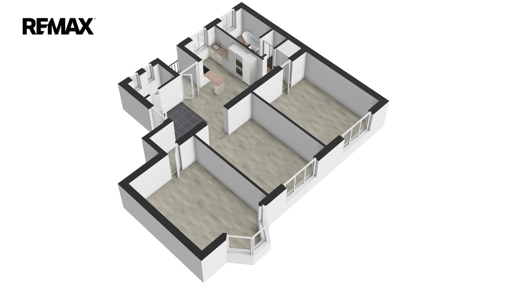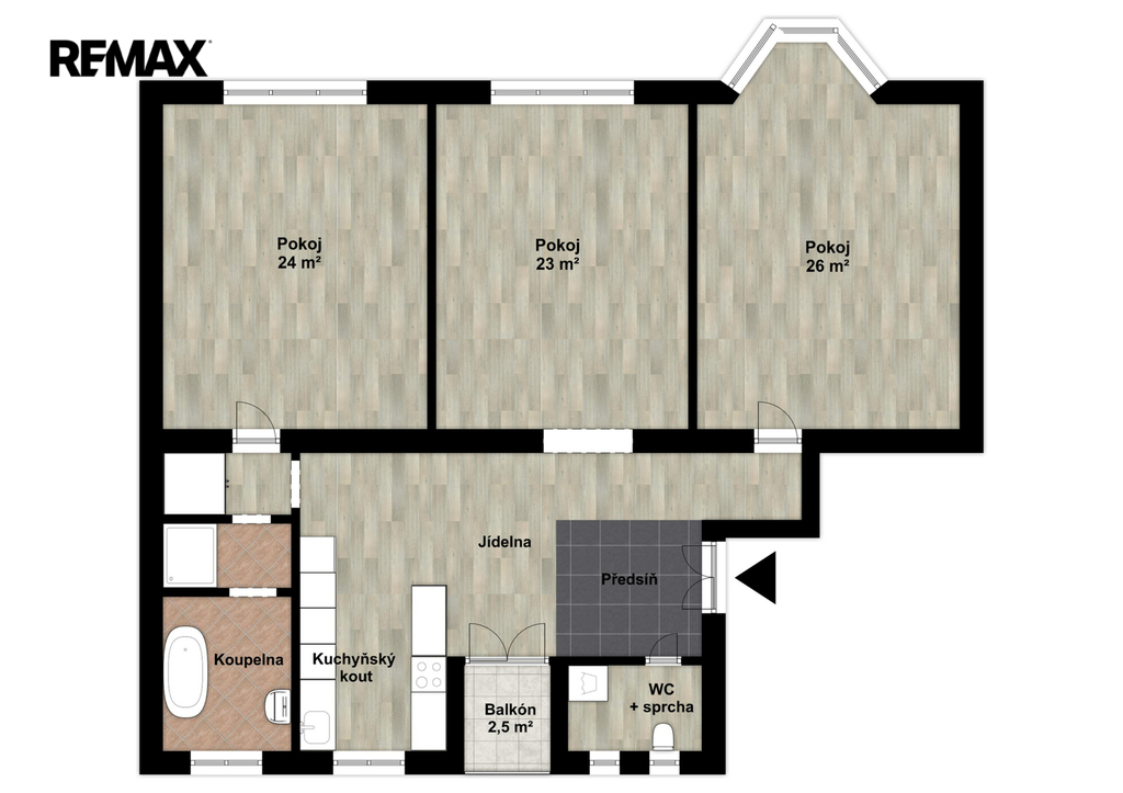 Dispozice zahrnuje moderní kuchyňský kout propojený s jídelnou, tři neprůchozí pokoje, prostornou koupelnu vybavenou vanou i sprchovacím koutem a samostatné WC (v místnosti příprava na sprchu/pračku).