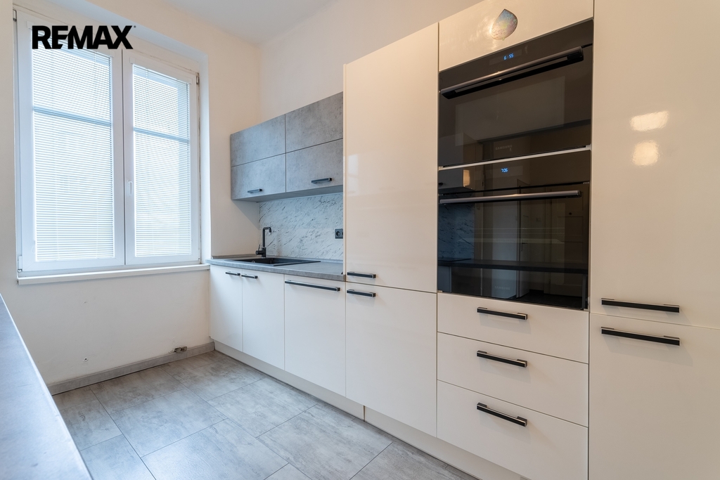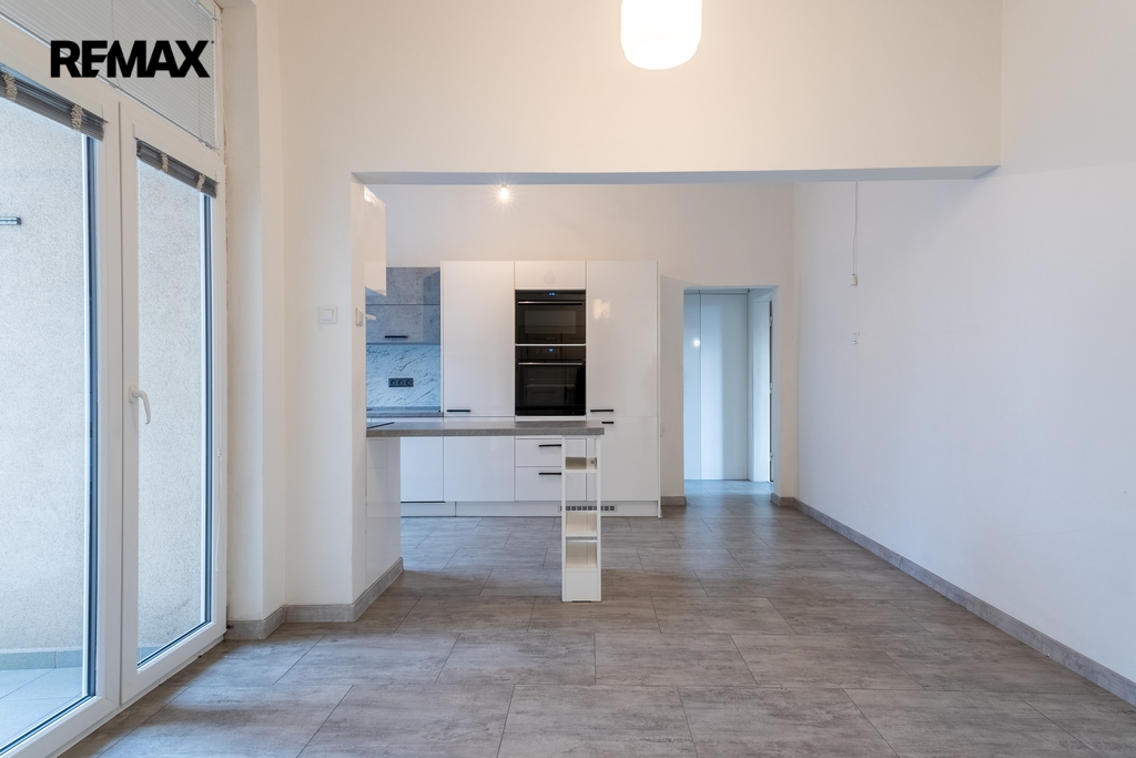 V současné době je byt dispozičně upraven na 4+kk (podlahová plocha celkem 112,95 m2 + sklep).