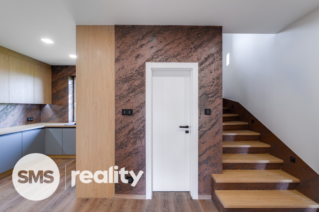 V přízemí vás přivítá reprezentativní vstupní hala, velkorysý obytný prostor s kuchyní, jídelnou a obývacím pokojem, doplněný pracovnou a koupelnou vybavenou vanou i sprchovým koutem. V patře se nacházejí tři samostatné ložnice a druhá koupelna se sprchou. Kuchyňská linka na míru je plně osazena špičkovými spotřebiči Bosch. Koupelny jsou vybaveny elektrickými topnými rohožemi pro maximální komfort.