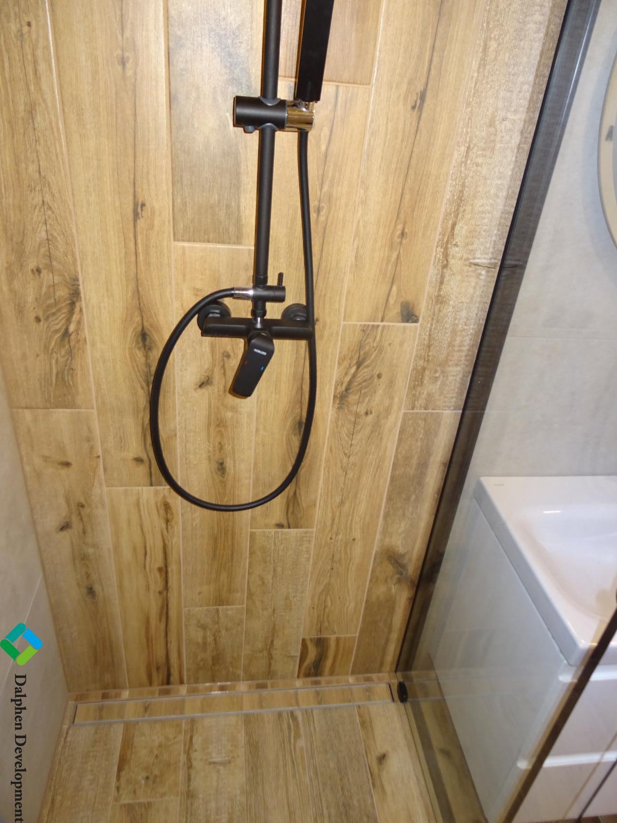 Koupelna: Zděné jádro, rozšířený prostor, sprchový kout 120 × 90 cm, vyhřívané zrcadlo a pračka se sušičkou Beko