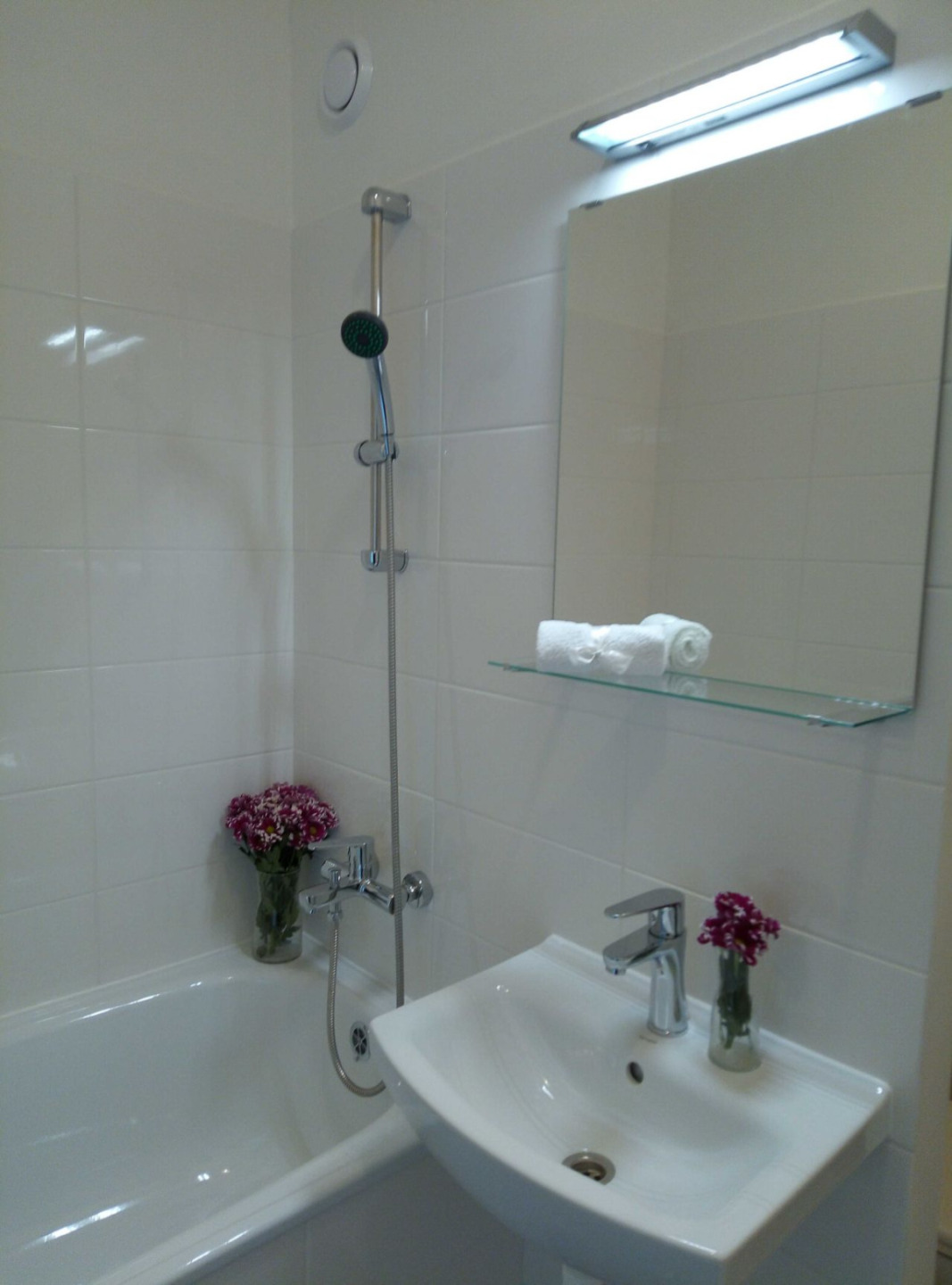 Koupelna s vanou a umyvadlem a s osvětlením, toaleta je součástí koupelny oddělená přepážkou.