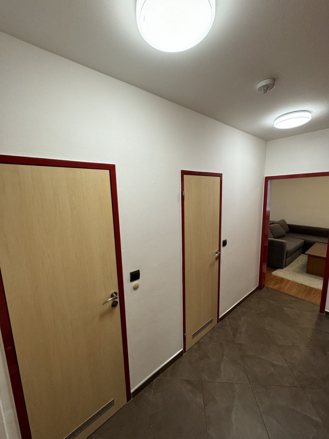 Byt prošel rekonstrukcí, která zahrnovala vyzdění jádra, položení plovoucích podlah, rozvody, sanitace, omítky a interiérové dveře.