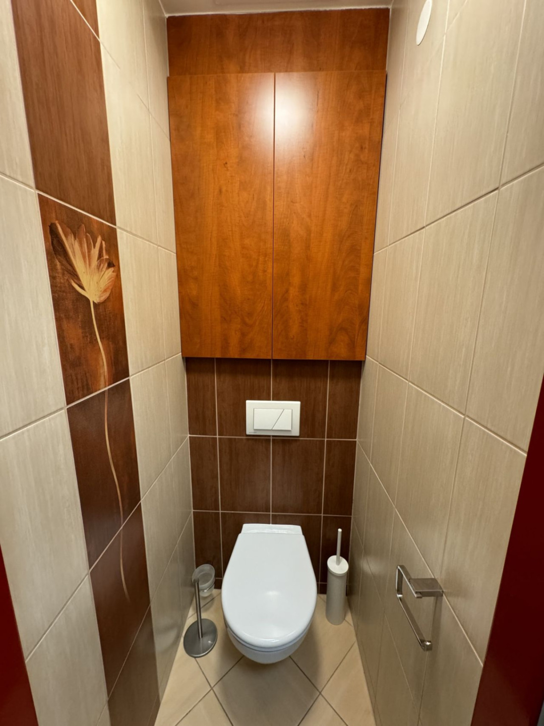 Koupelna disponuje vanou, umyvadlem s vestavěnou skříňkou a osvětlením. Pračka je součástí koupelny. Nad pračkou je také úložný prostor. Toaleta je odděleně.