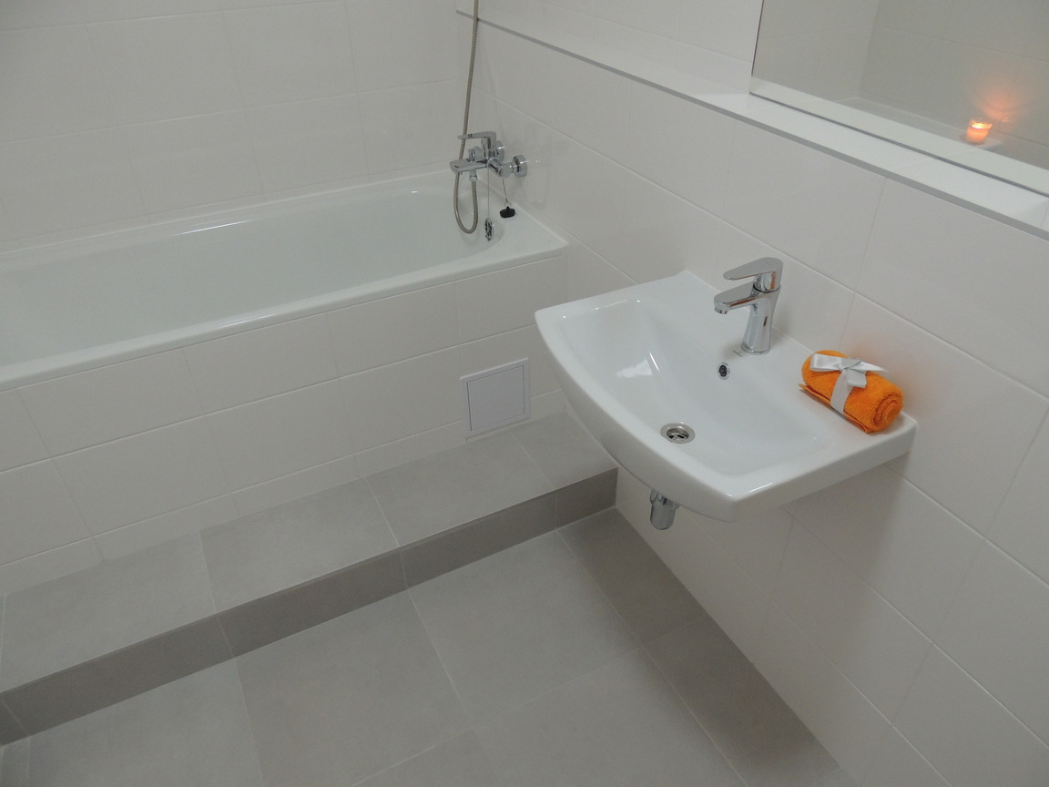 Koupelna s vanou a umyvadlem, toaleta je součástí koupelny.