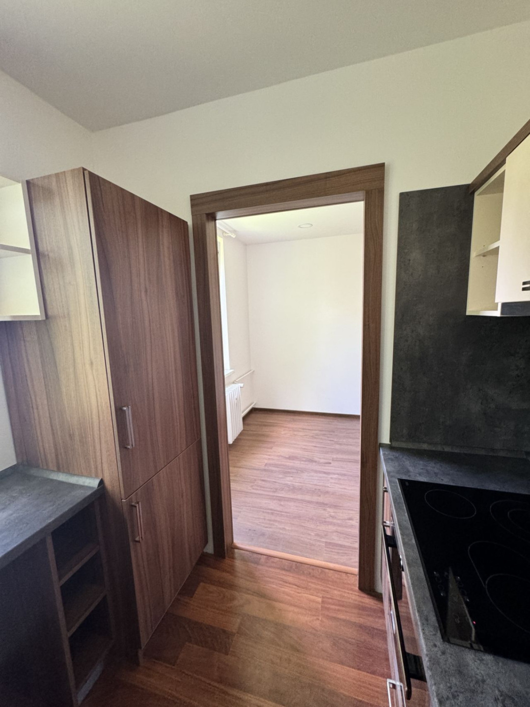 Z chodby se dostaneme do dvou neprůchozích pokojů a třetí pokoj je průchozí do kuchyně. Místnost u kuchyně lze využít například jako jídelnu.