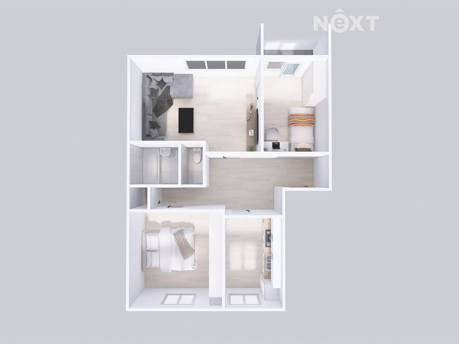 Dispozičně je tento byt opravdu zajímavý, a pokud máte rádi moderní otevřenou dispozici obýváku s kuchyní, tak tady by to mělo být možné.