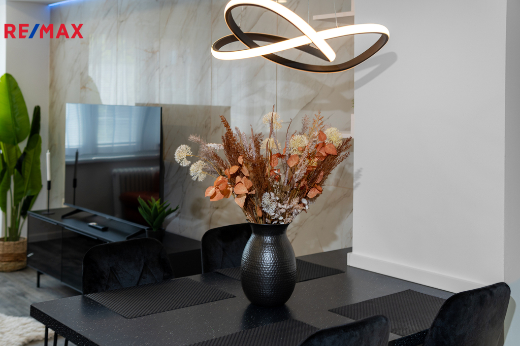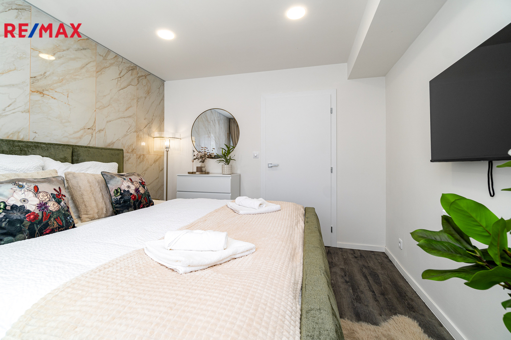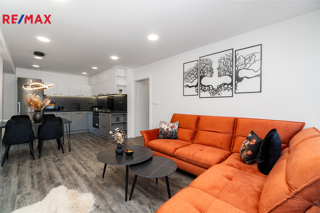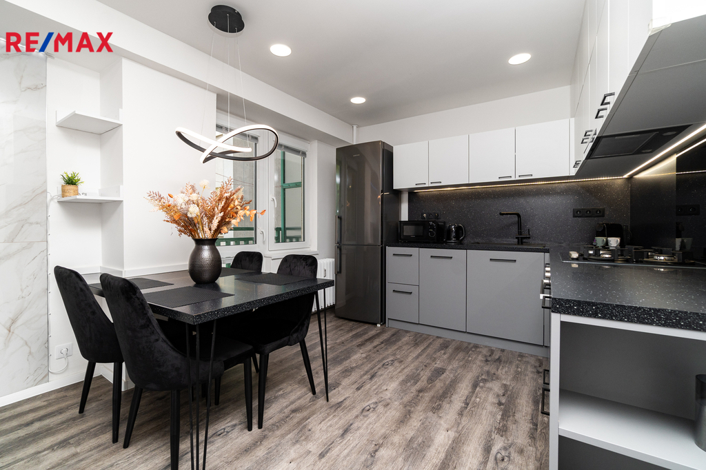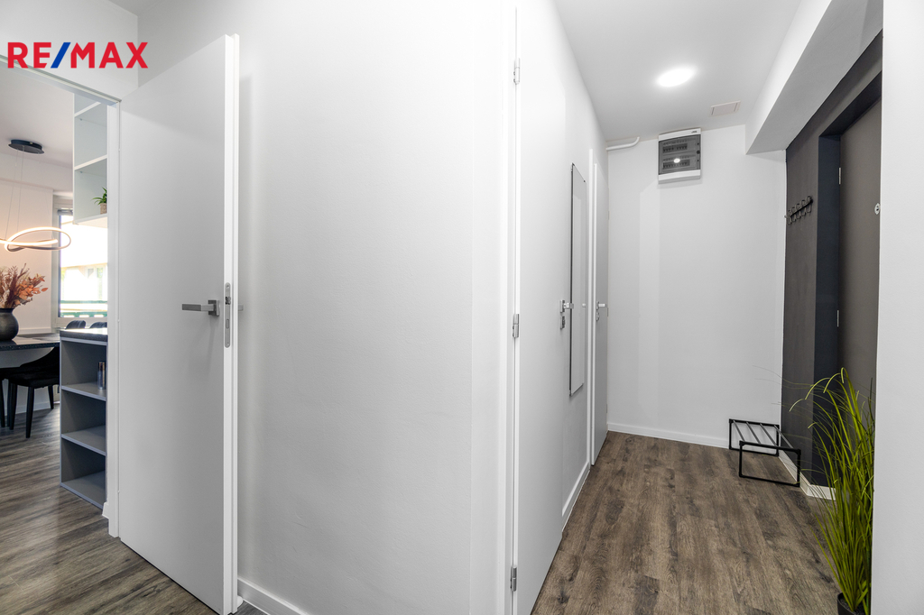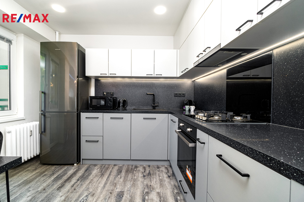 Byt prošel kompletní proměnou – vše je zcela nové: moderní kuchyňská linka s vestavnými spotřebiči, koupelna s pračkou a sušičkou, nové podlahy, dveře, elektroinstalace i sanita.