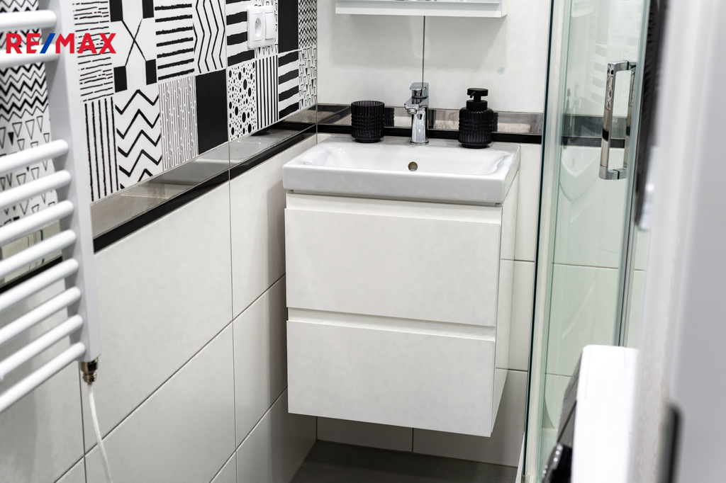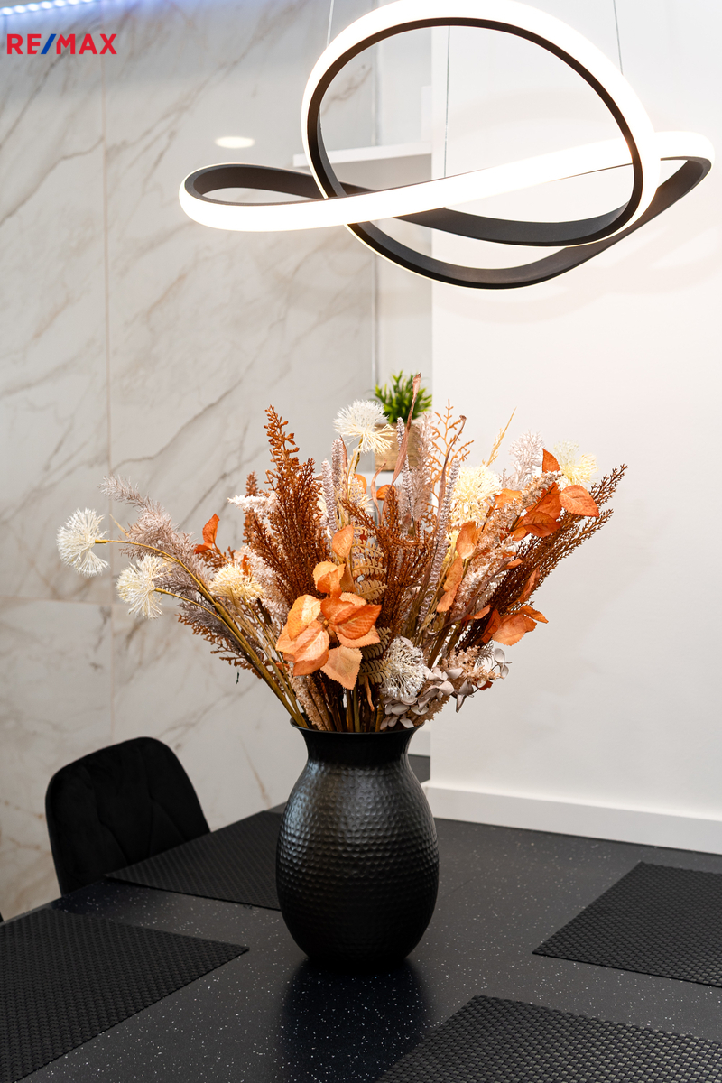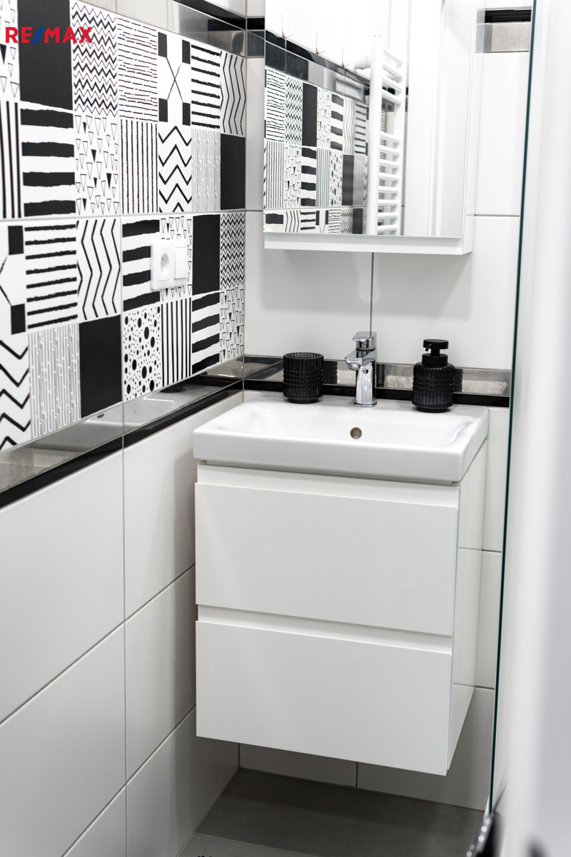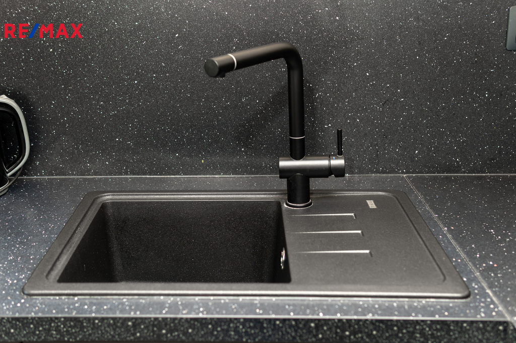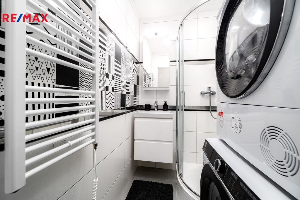 Byt prošel kompletní proměnou – vše je zcela nové: moderní kuchyňská linka s vestavnými spotřebiči, koupelna s pračkou a sušičkou, nové podlahy, dveře, elektroinstalace i sanita.