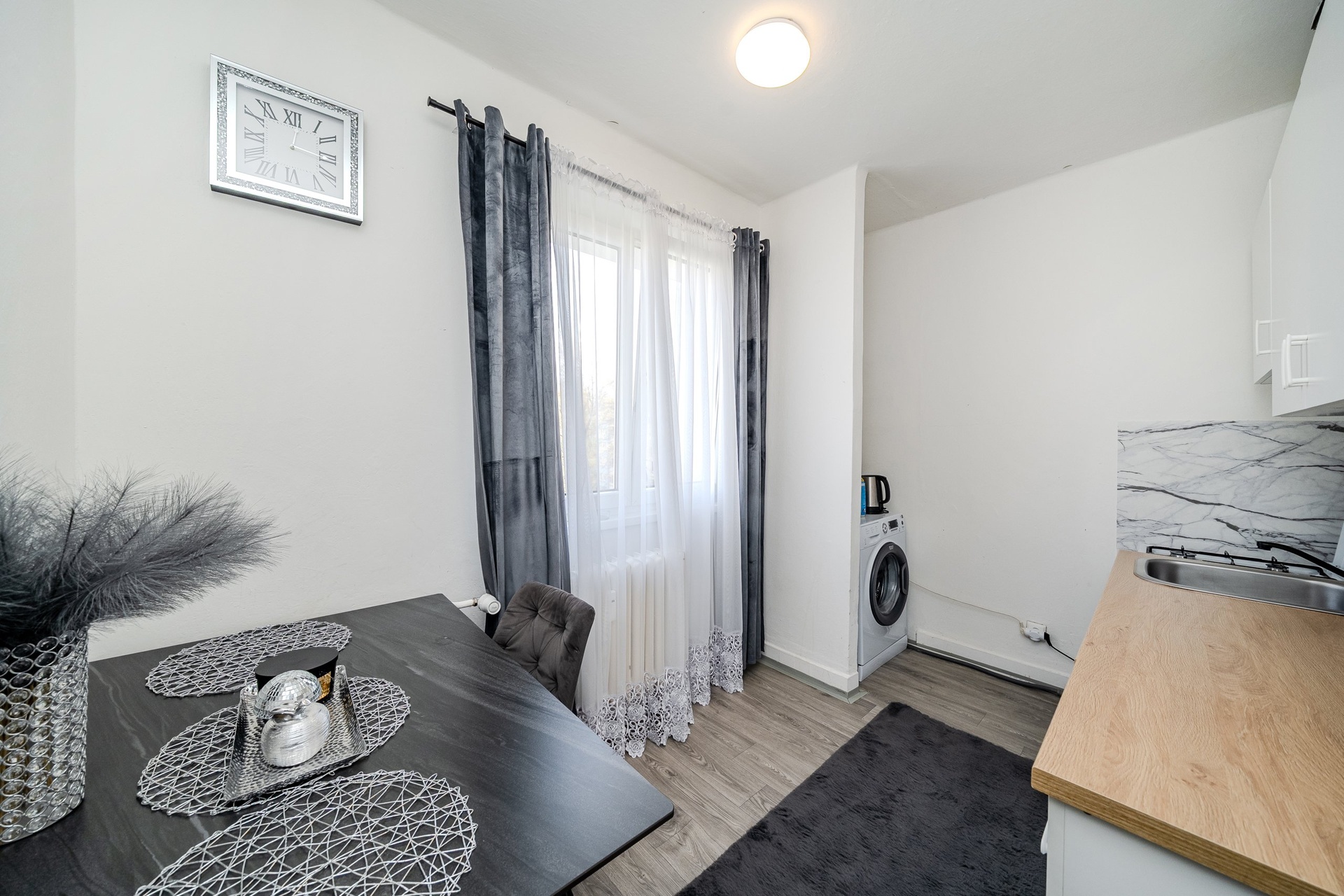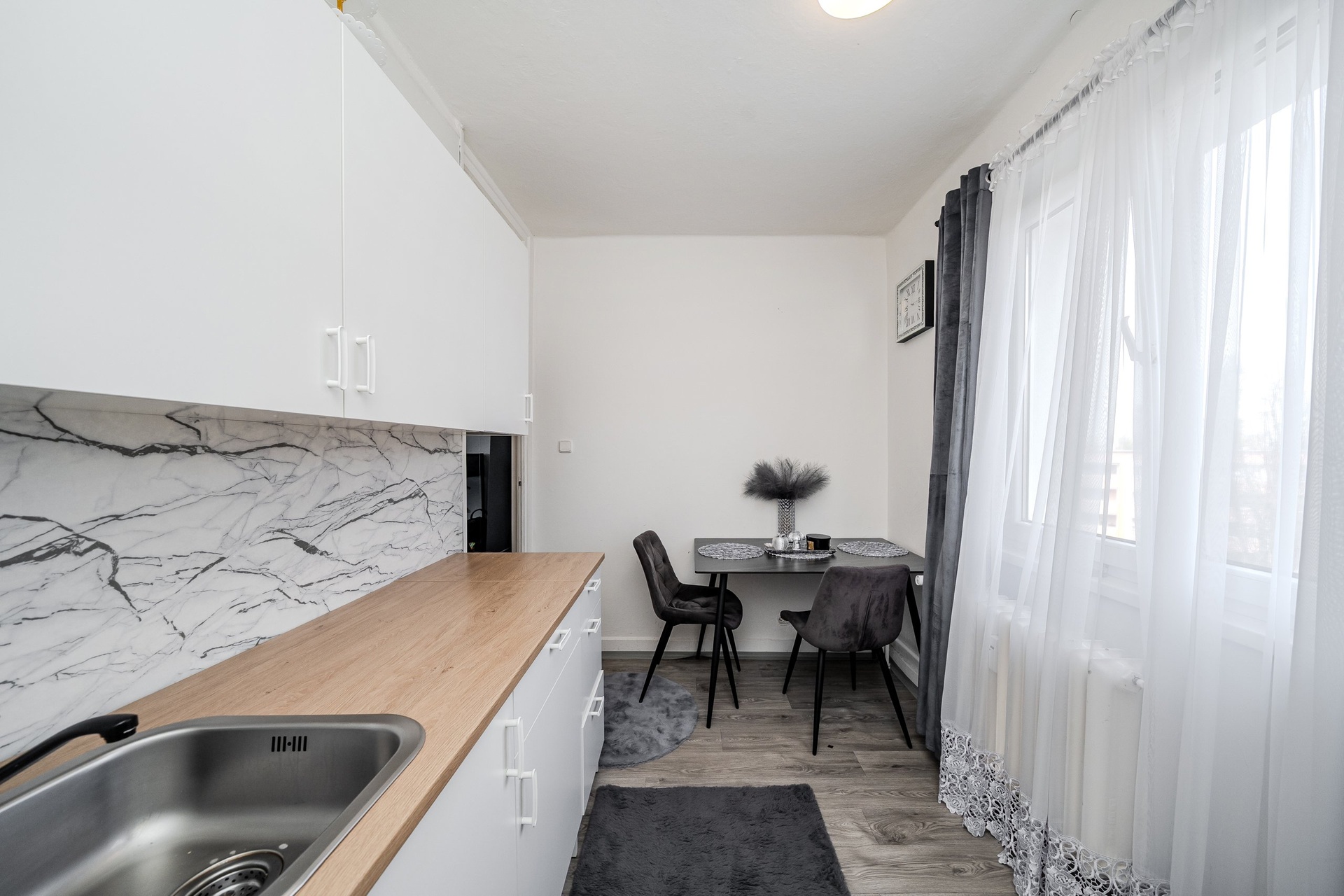 Obývací pokoj je orientovaný na jihozápad a severozápad, což přináší slunce zejména v odpoledních a podvečerních hodinách. Součástí je francouzské okno s menším balkónkem, který prostor opticky otevírá a dodává mu vzdušnější charakter. Druhý pokoj a kuchyně jsou orientovány na severovýchod do klidnější části, což zajišťuje příjemnější klima i v letních měsících.