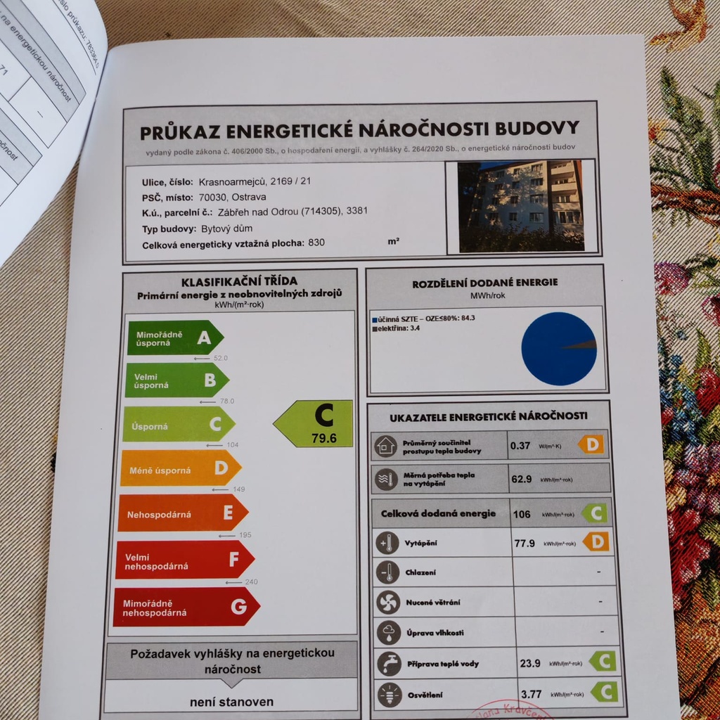 - Ukazatel energetické náročnosti budovy: 79 kWh/m²