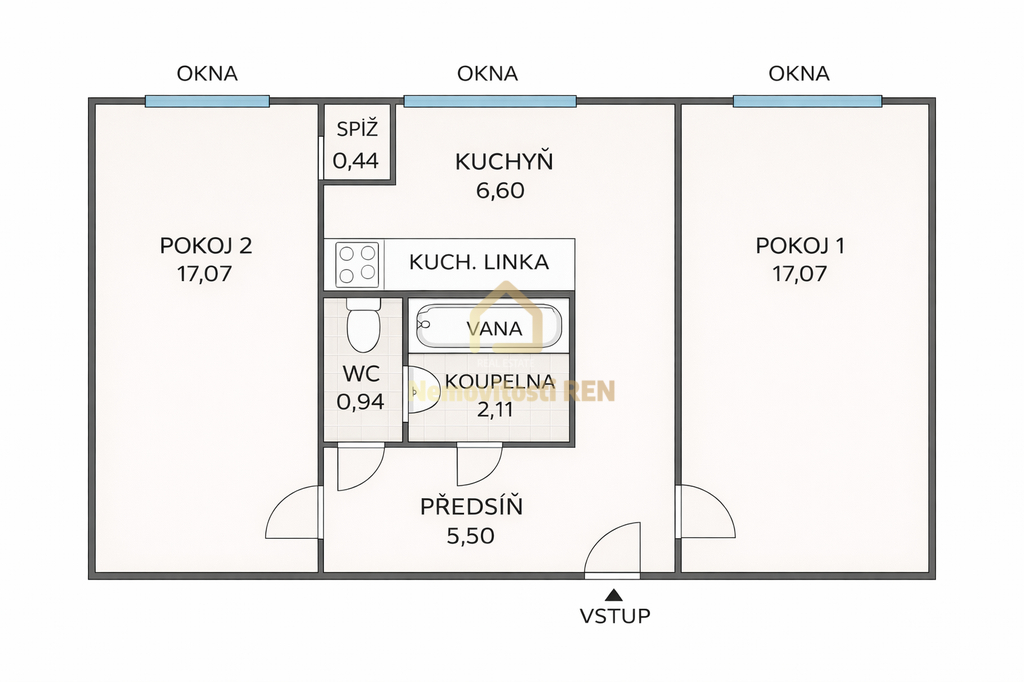Byt o celkové ploše 53 m² má praktickou dispozici s neprůchozími pokoji, což zajišťuje dostatek soukromí a pohodlí pro každodenní bydlení. Dispozice je vhodná jak pro vlastní bydlení, tak i jako investice k pronájmu.