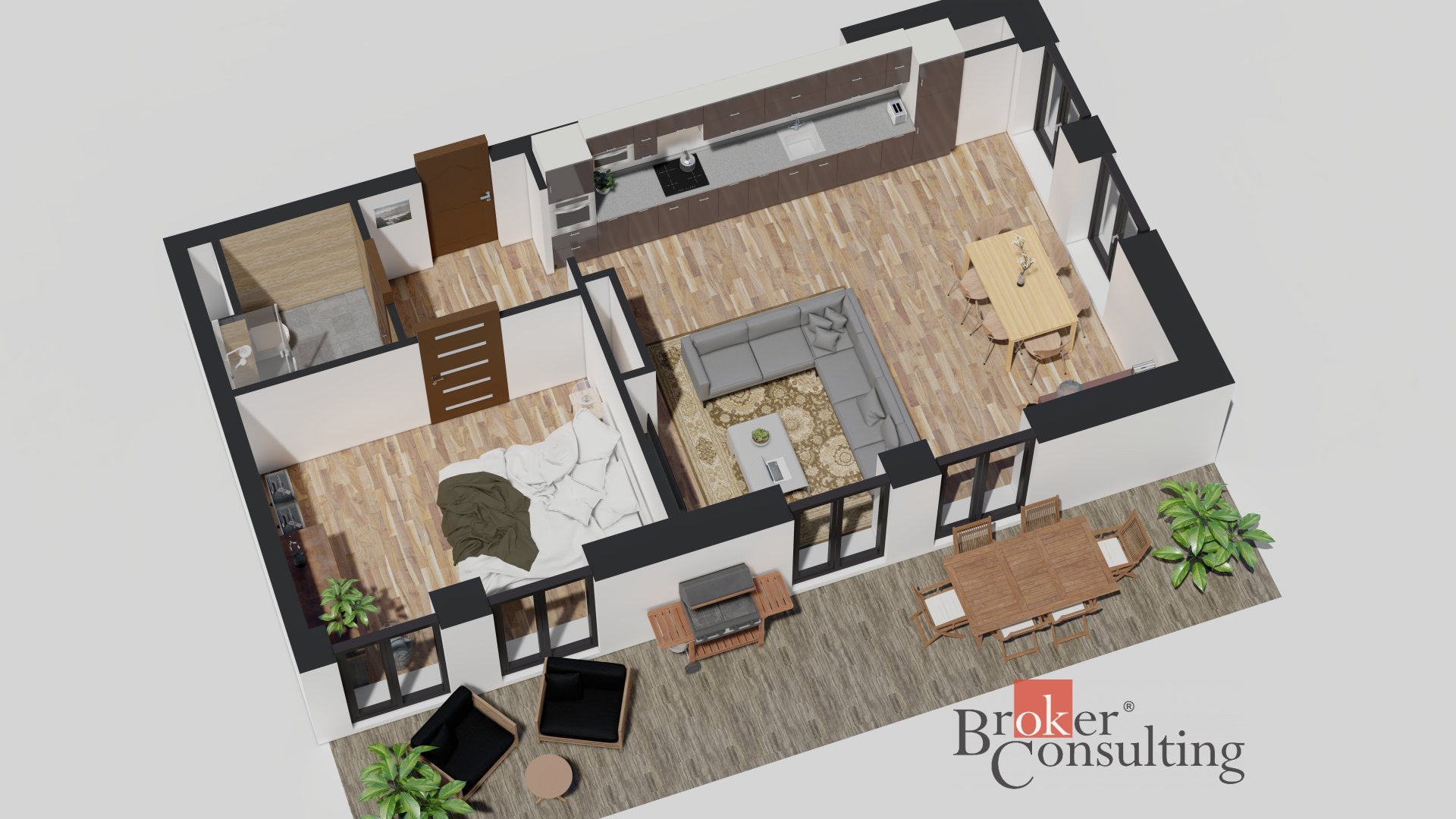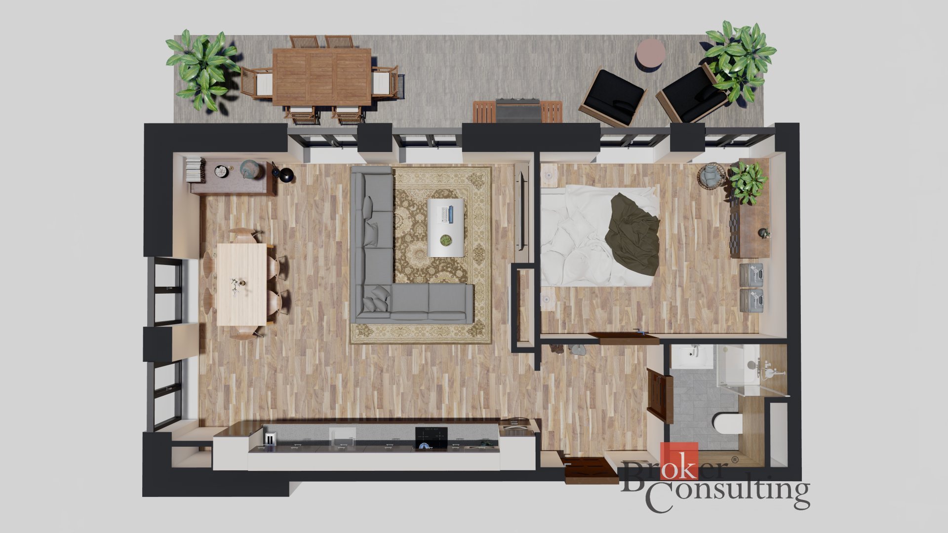 K bytu náleží prostorná terasa o výměře 43,48 m² a přímý vstup na vlastní zahrádku, ideální pro relaxaci nebo rodinné posezení.