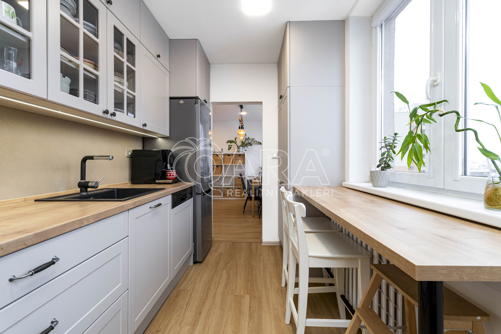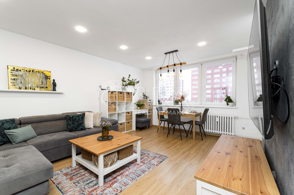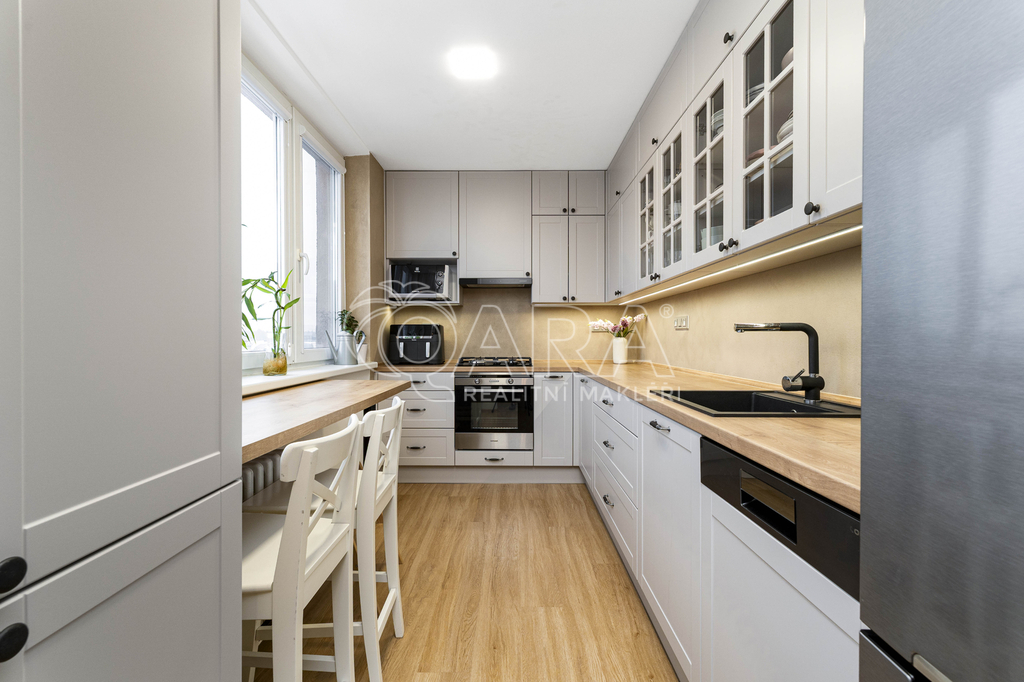 Byt je umístěn v 8.NP v panelovém domě s výtahem a před pěti lety prošel rekonstrukcí. Nabízí praktické a funkční dispoziční řešení, které poskytuje dostatek prostoru jak pro společné rodinné chvíle, tak pro klid a soukromí. Díky velkým oknům je byt příjemně světlý a působí vzdušně. Prostorná kuchyň v rustikálním stylu potěší každého, kdo si rád užívá vaření.