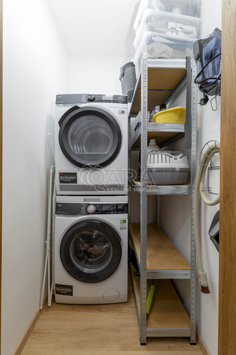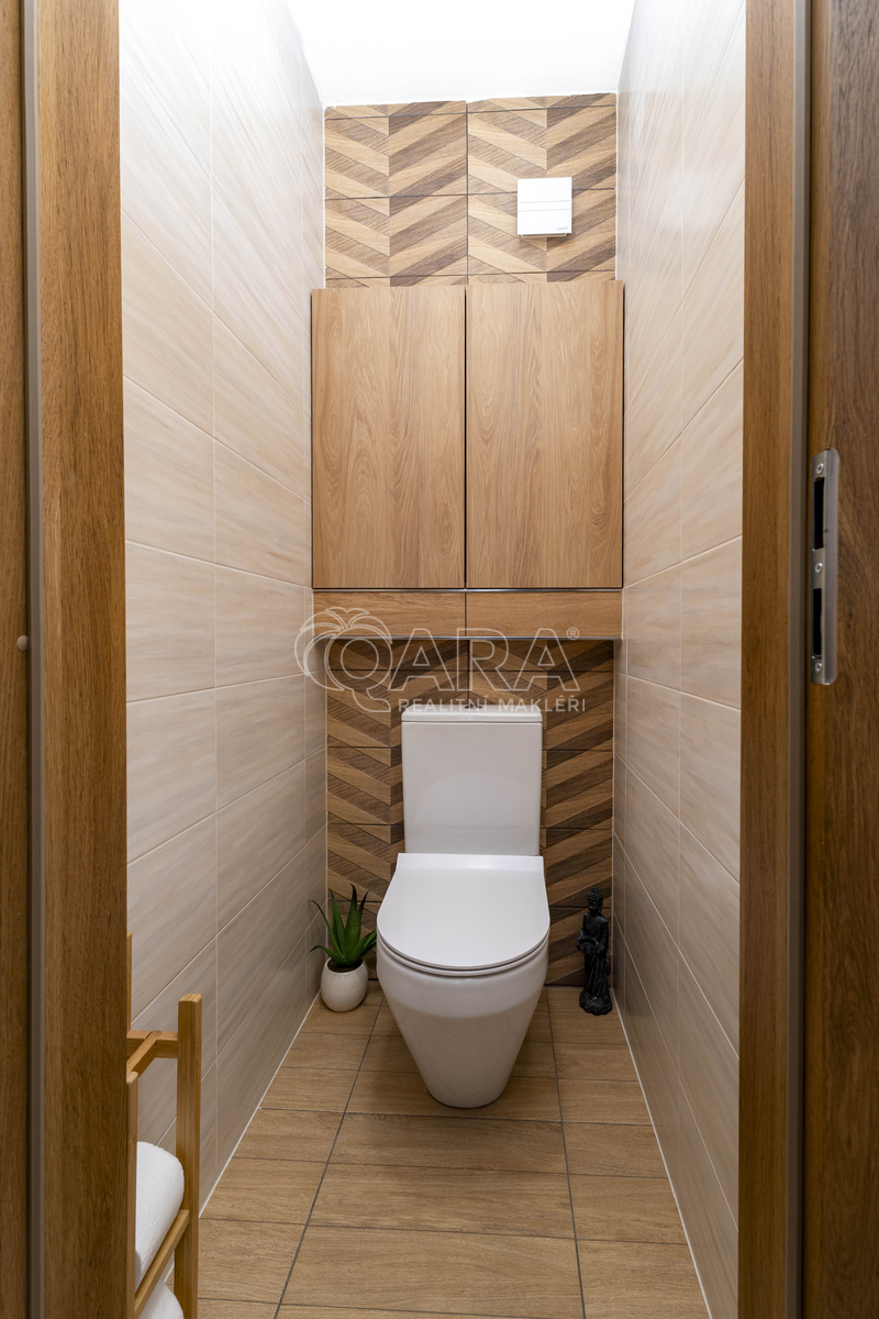 Velkou výhodou je také samostatná šatna, ve které je umístěna pračka a sušička. Toto řešení výrazně zvyšuje komfort bydlení, jelikož koupelna zůstává bez rušivých spotřebičů.