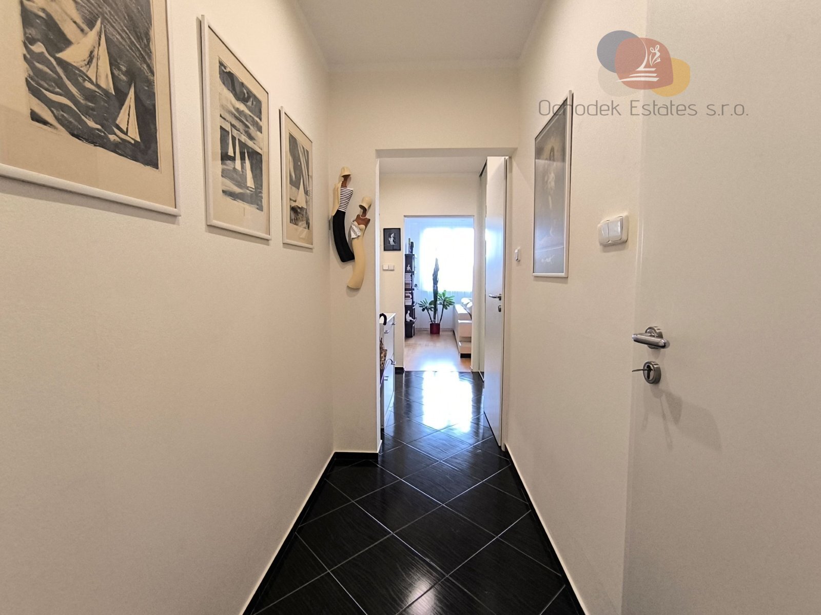 Při vstupu do bytu vás zaujme otevřenost prostoru. Díky přestavbě dispozice je zde dán důraz na čisté linie i vysokou praktičnost. Z chodby vás to totiž přirozeně zavede do obýváku a ani si nevšimnete, že jste minuly tři velké vestavěné skříně se spoustou úložného místa. Obývák je tu doslova centrem pro vaši rodinu i přátele a díky svojí otevřenosti je přirozeně propojený s jídelnou a dále kuchyní. Kuchyň je tu samozřejmě dělaná na míru a věřte mi, že tady vás bude bavit umývat nádobí. Dřez je tu posazený přímo pod okno s výhledem na stromy.