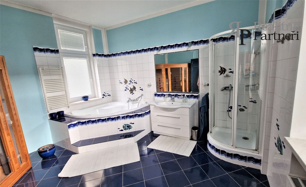 V prvním patře je vstupní chodba, samostatné WC, prostorná kuchyň, obytný pokoj, prostorný obývací pokoj, koupelna s vanou, sprchovým koutem a saunou.