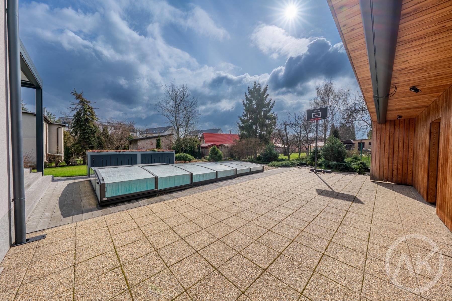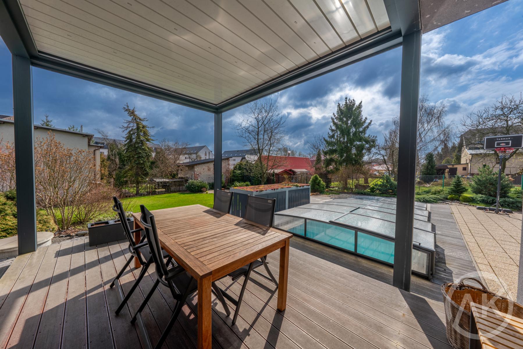 Až vás to uvnitř omrzí, vyběhnete přes HS portál na terasu a skočíte si do bazénu. Ten je krytý a vyhřívaný, takže sezona klidně od března do listopadu. Pergola je hliníková, bioklimatická, s výhřevem i zabudovaným osvětlením.