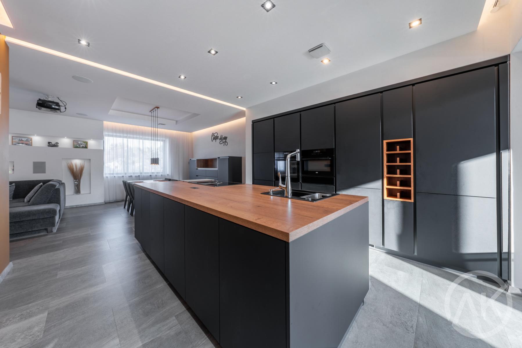 Nadchlo mě propojení obývacího pokoje s jídelní a kuchyňskou částí, které je řešeno do tvaru L. Při práci v kuchyni to nepůsobí rušivě do obývacího pokoje. Protože je zde dostatek světla, kuchyně v kombinaci černého matu a dřeva působí skvěle a vytváří příjemnou domácí atmosféru. Je to určitě i tím, že spotřebiče jsou zabudované a celý prostor působí minimalisticky a vzdušně.