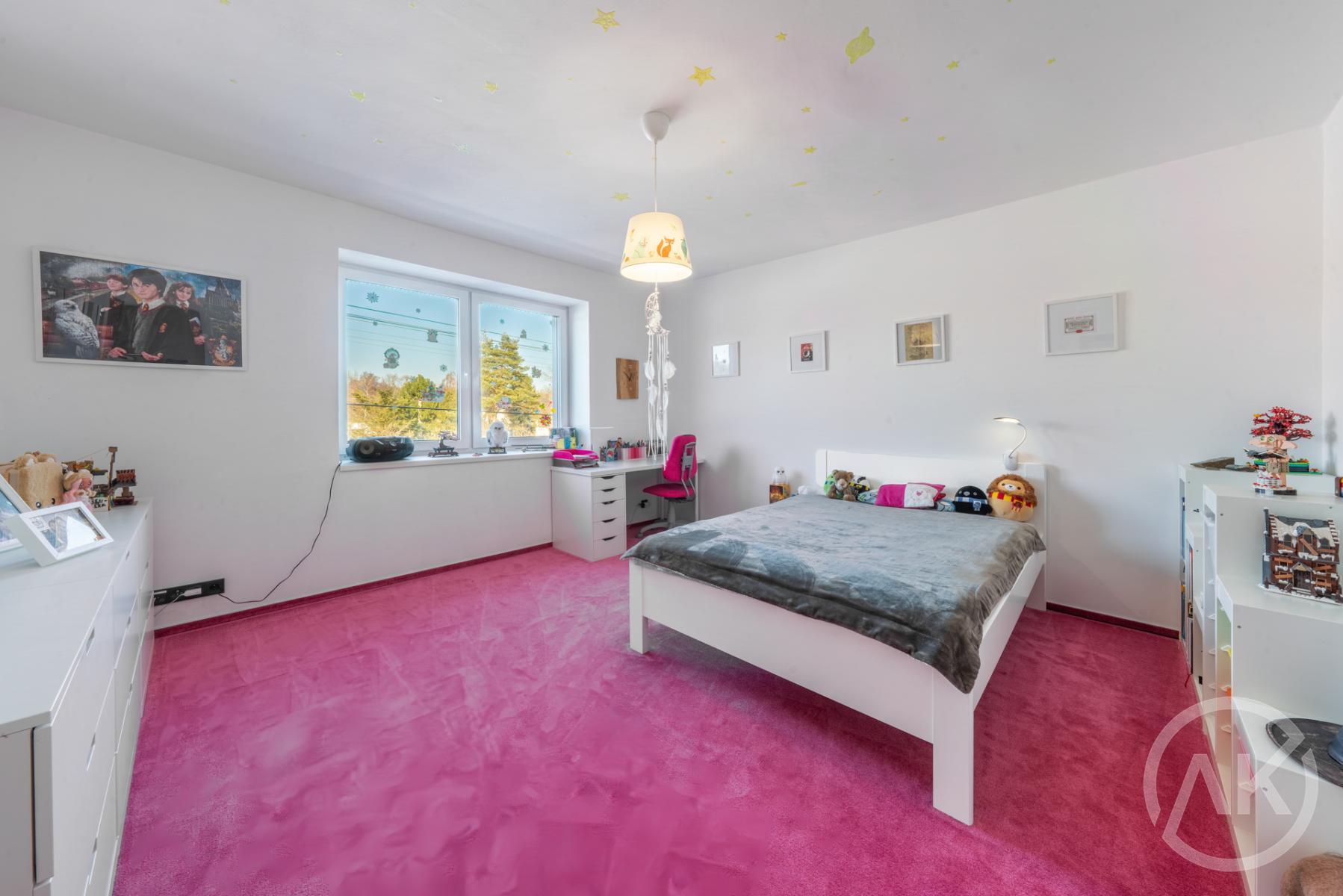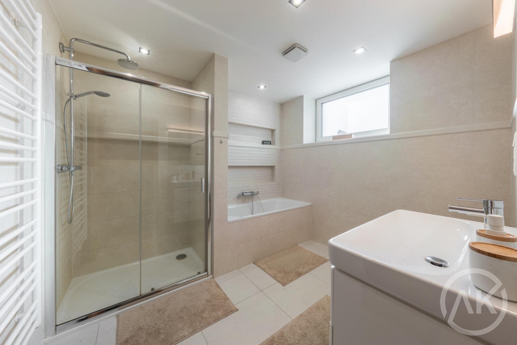 V obou patrech jsou koupelny, vždy s vanou a sprchovým koutem. Dole pak ještě pracovna a nahoře tři velké pokoje, prádelna s šatnou a balkon.