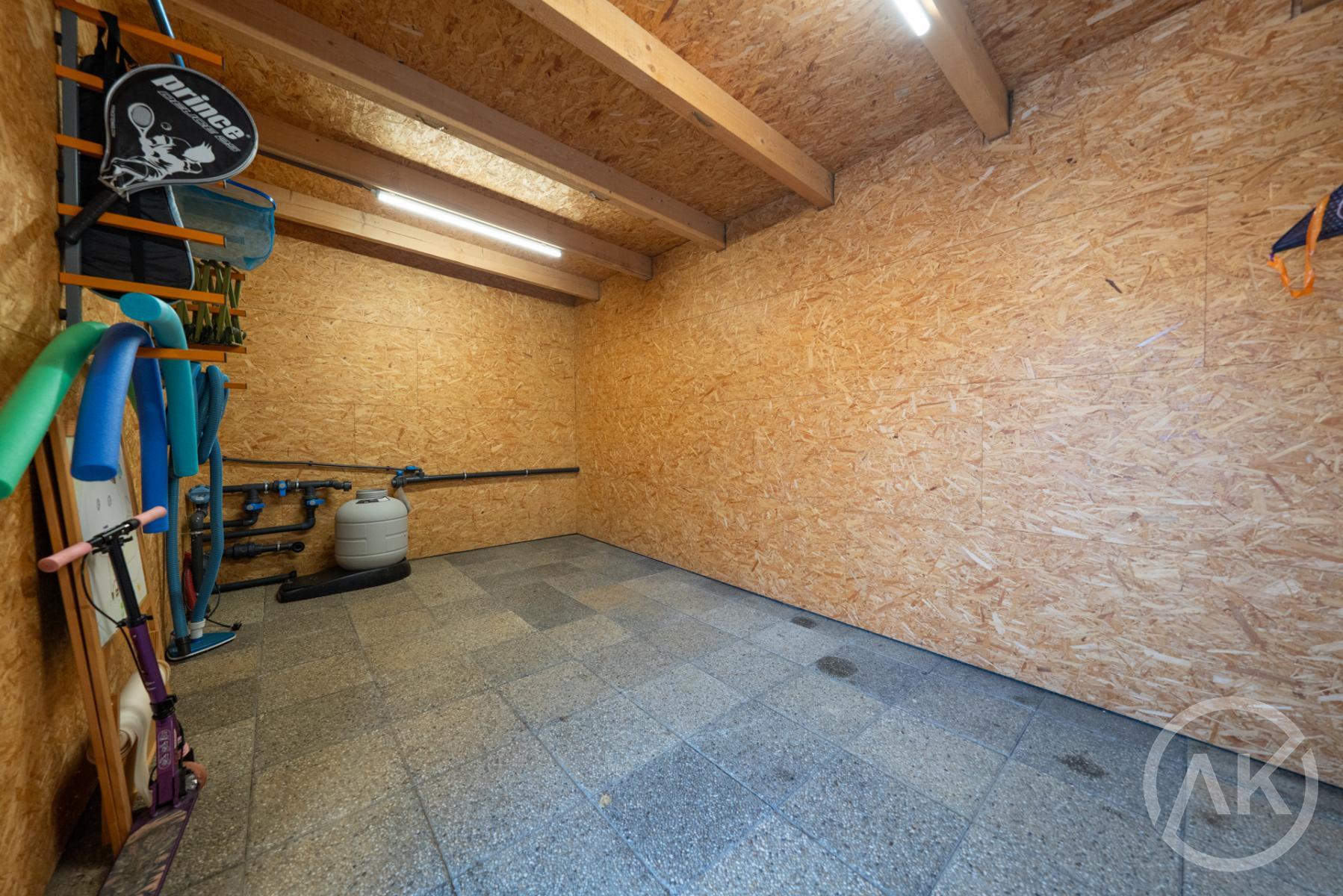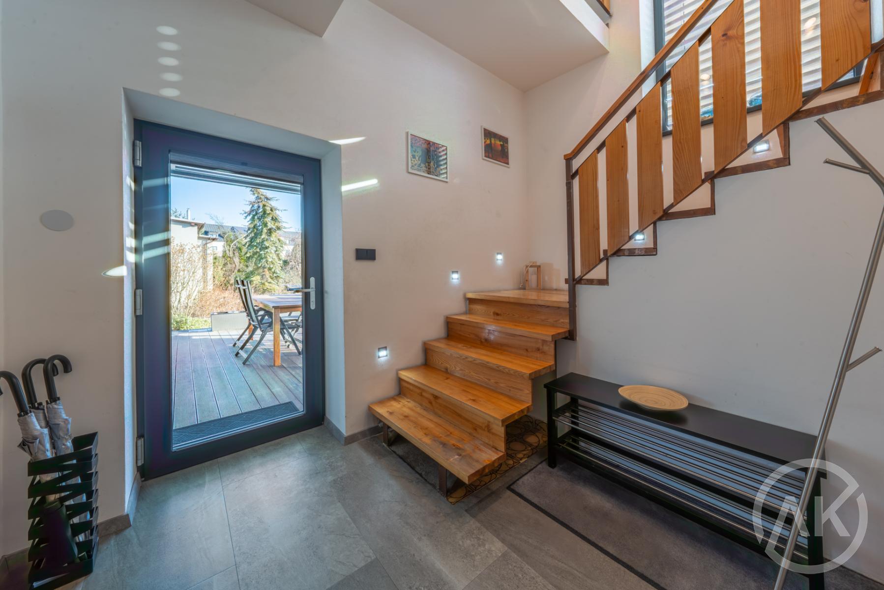 V rámci technických věcí stojí ještě za zmínku venkovní elektrické rolety, vytápění plynovým kotlem, aktivní přítah vzduchu do krbu nebo rekuperace. Protože je dům podsklepen, je zde i prostor pro menší fitko nebo wellness.
