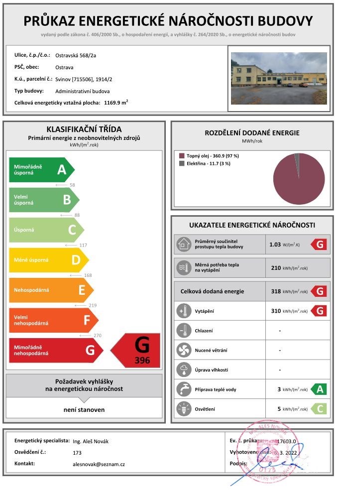 - Energetická náročnost budovy: G - Mimořádně nehospodárná