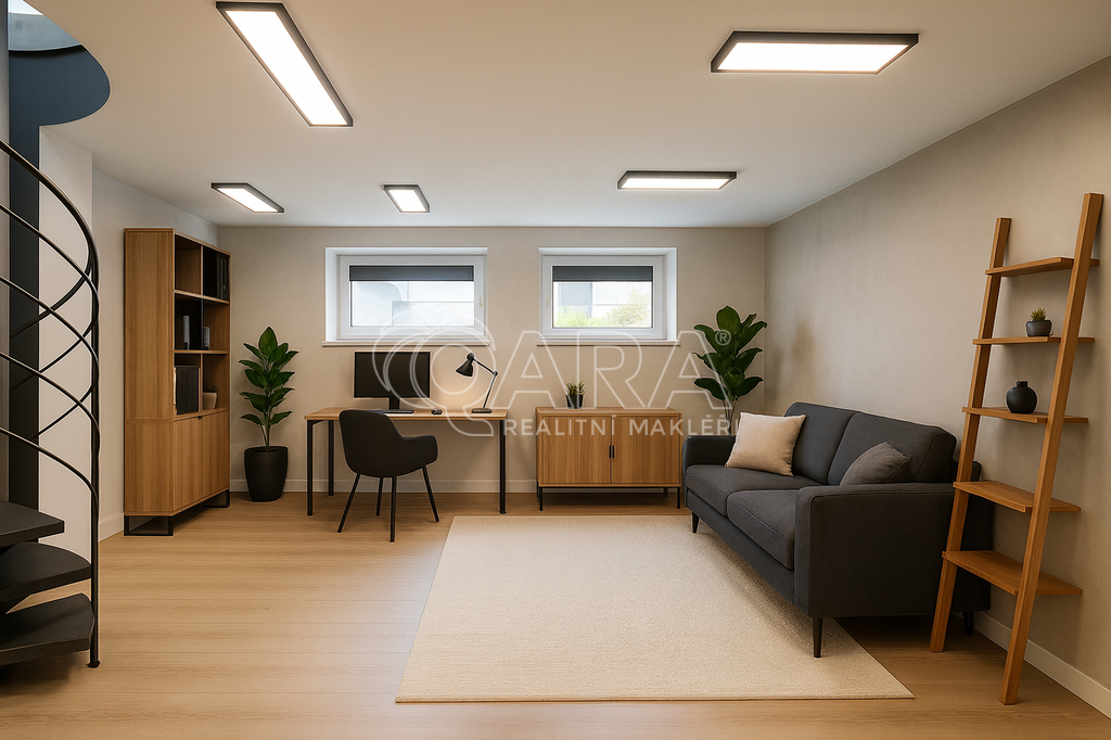 Dvě podlaží dávají spoustu možností – v přízemí můžete mít salon krásy, ordinaci nebo obchodní prostor, v suterénu zase zázemí, sklad nebo klidné místo pro kancelář.