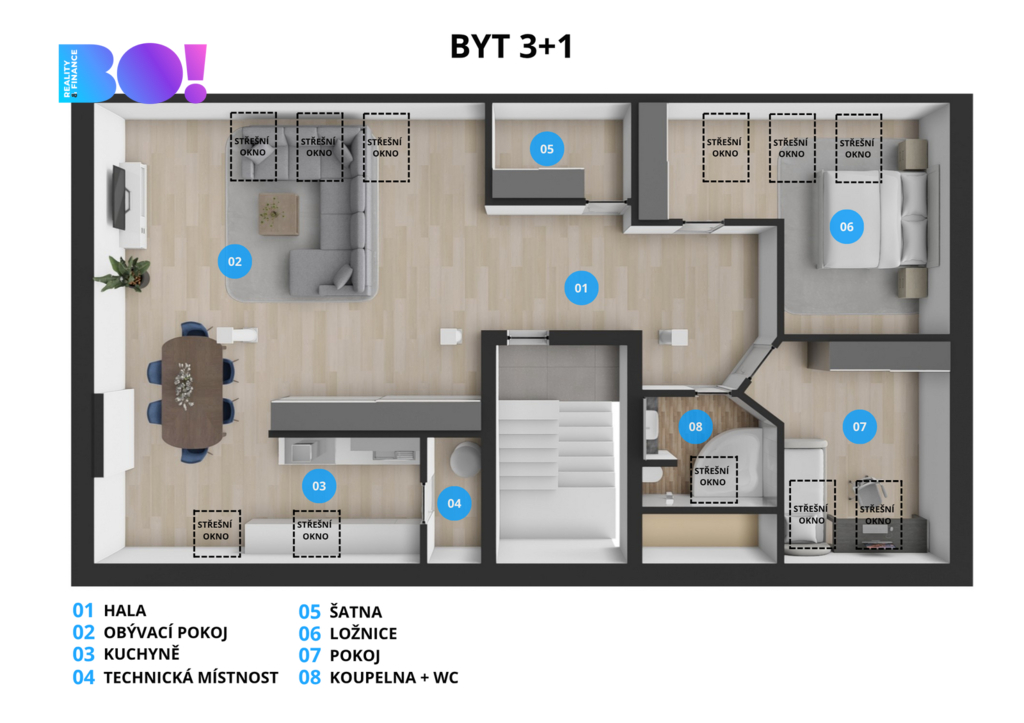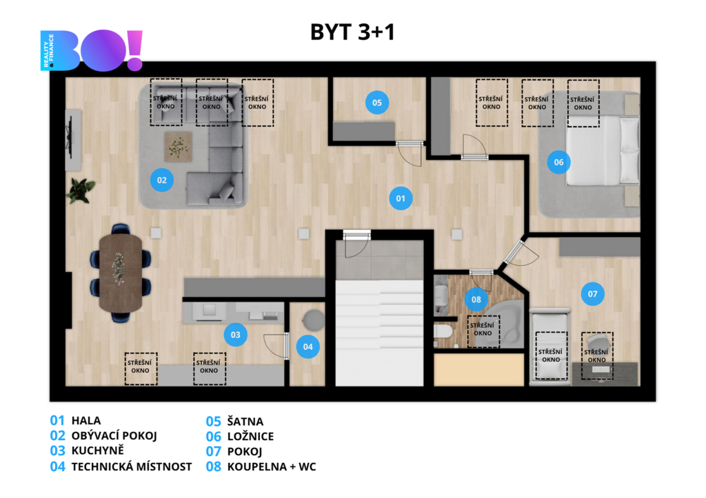 Díky střešním oknům je interiér krásně prosvětlený. V bytě jsou přiznané dřevěné konstrukce krovu. Tyto prvky podtrhují otevřenost a jedinečný charakter celého prostoru, vše působí útulně a harmonicky.
