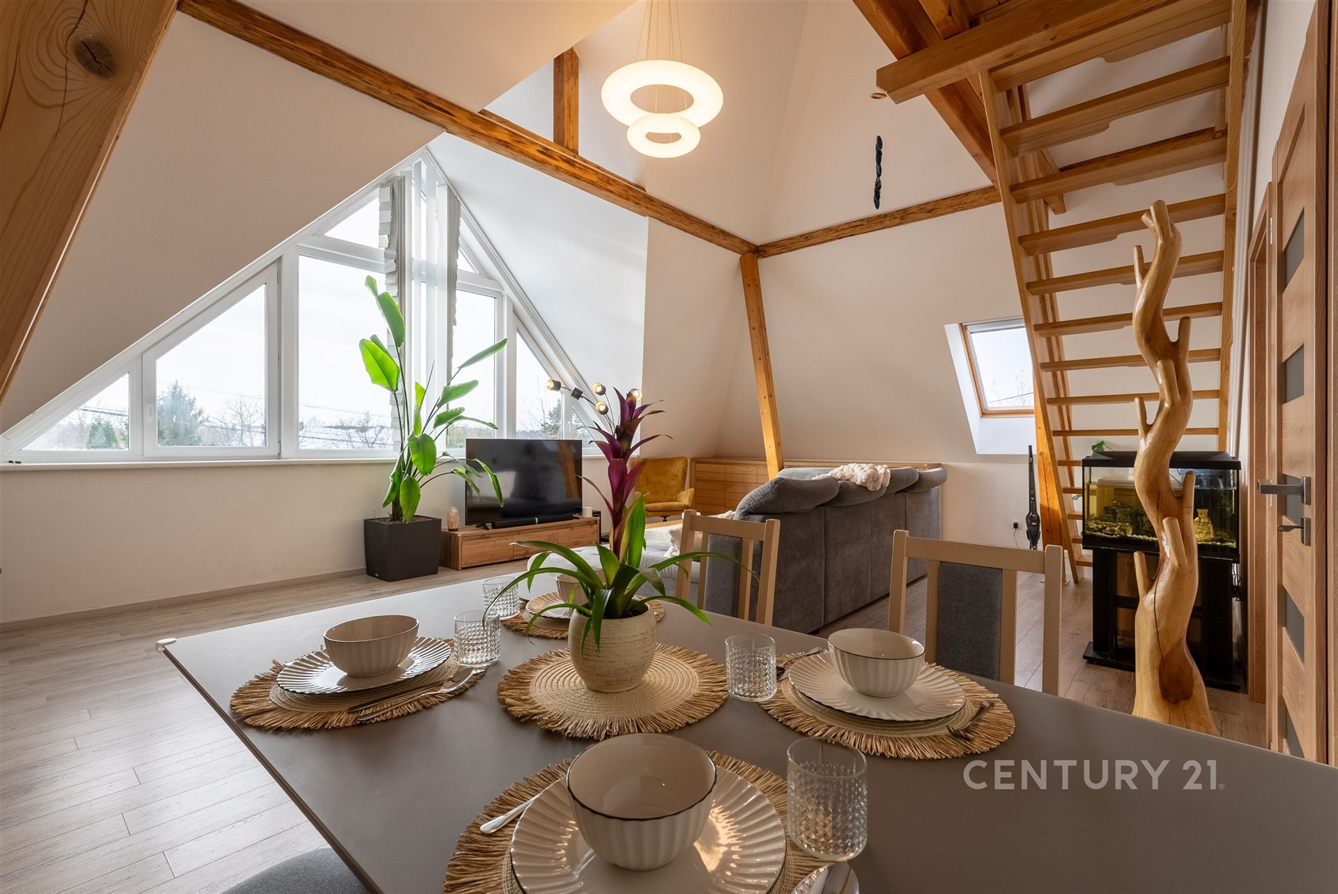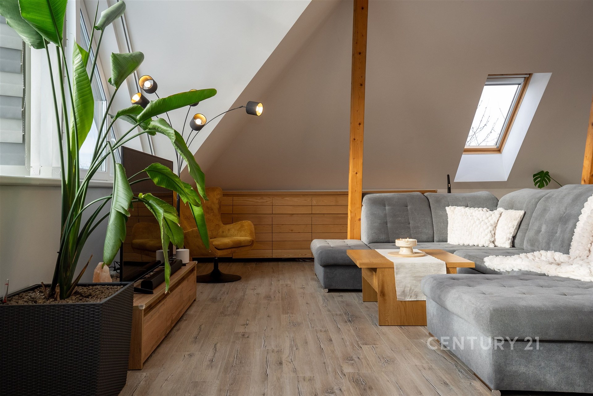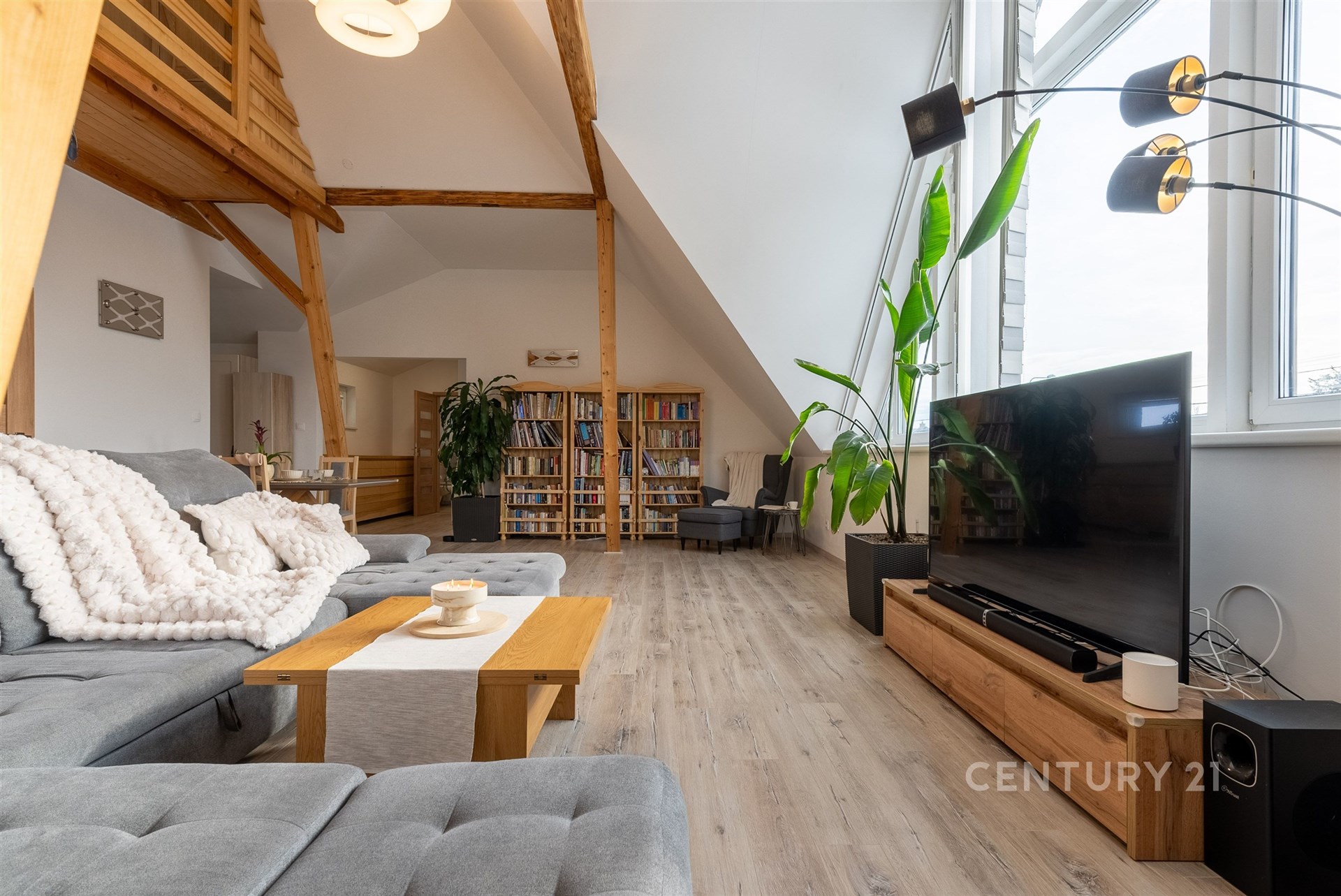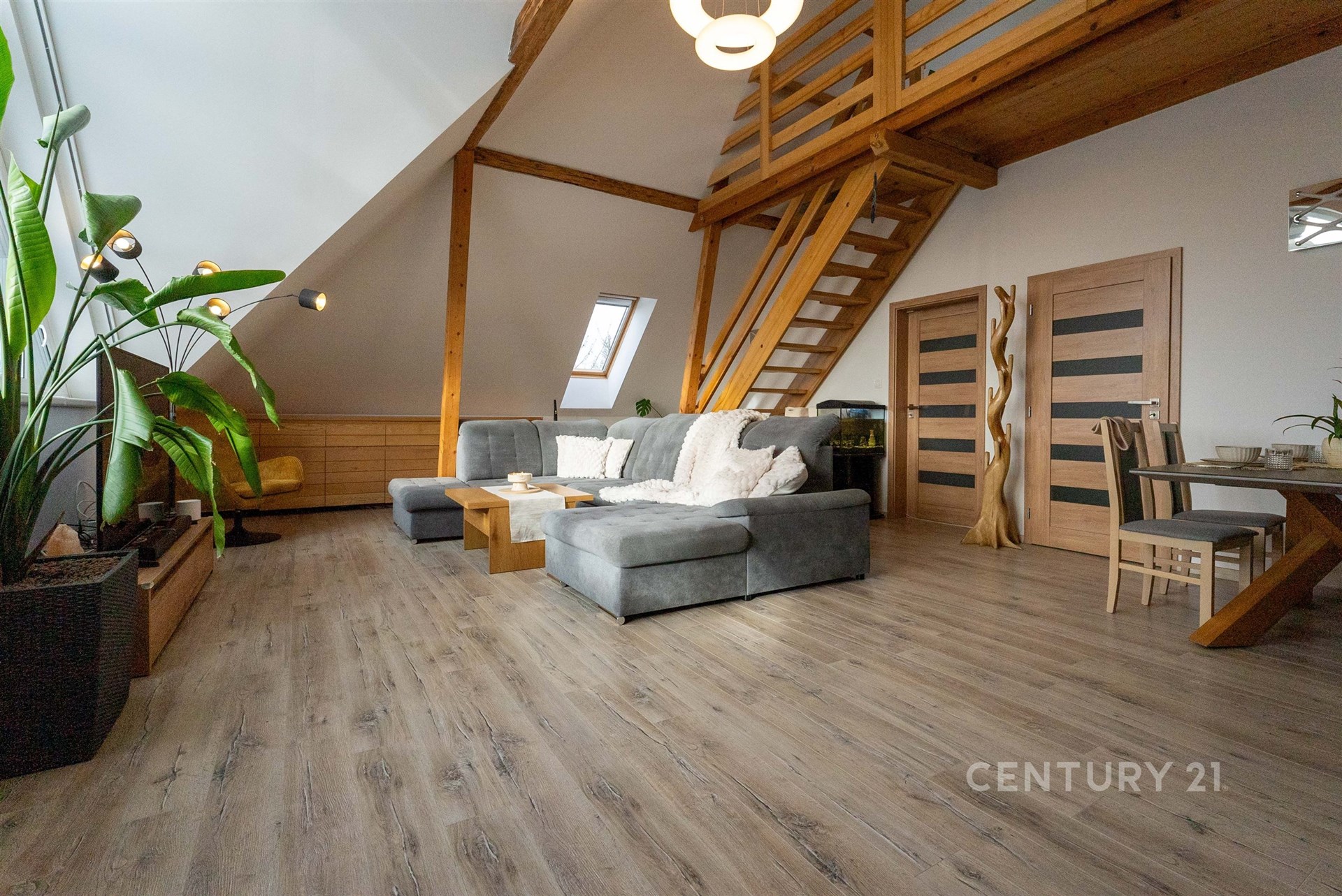 Hlavní byt se nachází v 1. NP a nabízí dispozici 3+kk s mezonetem. Dominantou je velký obývací prostor s architektonicky navrženým trojúhelníkovým oknem a vysokým stropem až 7–8 metrů. Kuchyně je v rurálním stylu s moderními spotřebiči, nechybí prádelna ani druhá toaleta. Z obývací části vede schodiště do mezonetu, kde je další ložnice s klimatizací a vestavěnými skříněmi na míru. Celý byt je vybaven kombinací podlahového vytápění a technologie Heatflow, novými trojskly a osvětlením s designovými prvky. Součástí je také inteligentní domácnost Loxone.