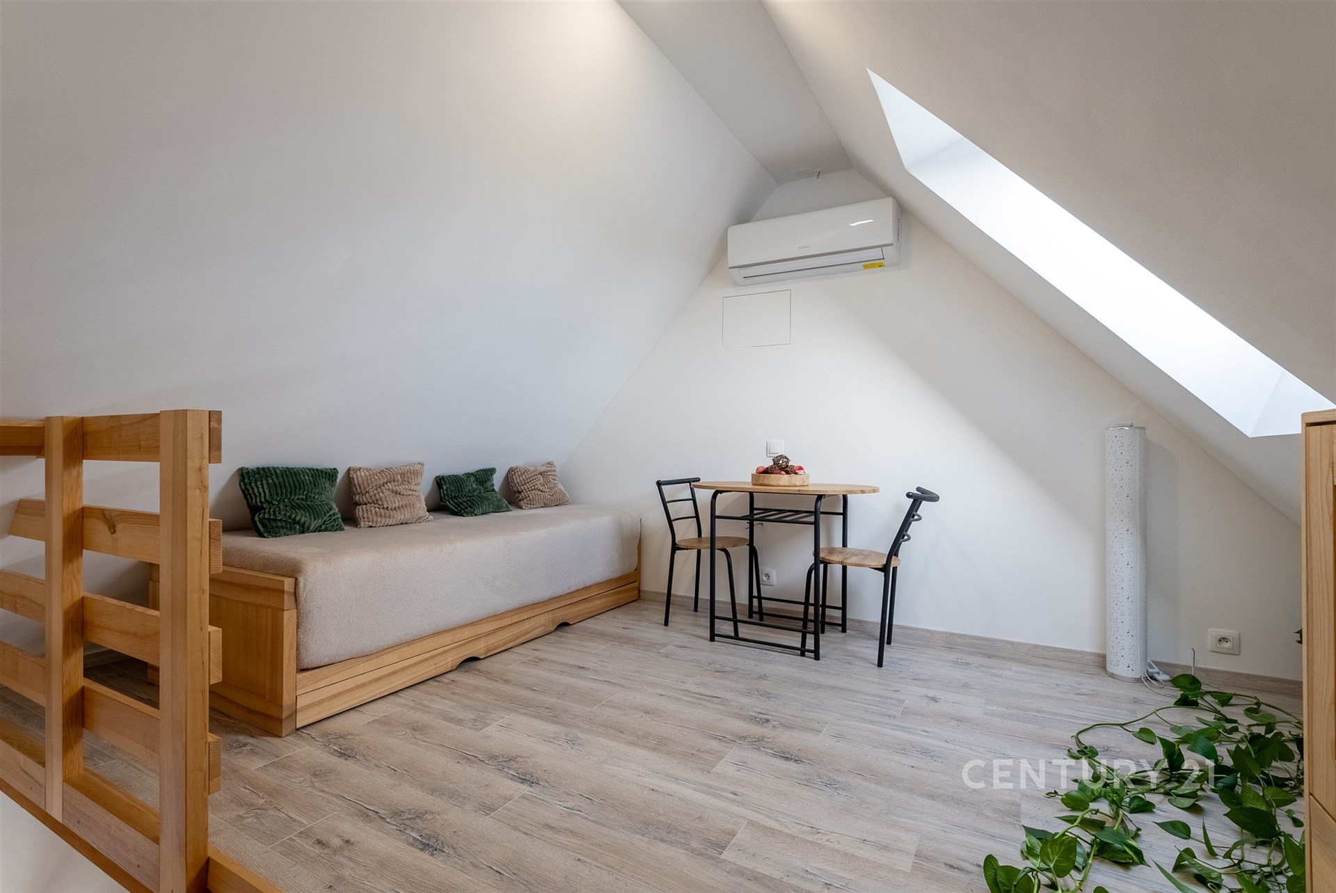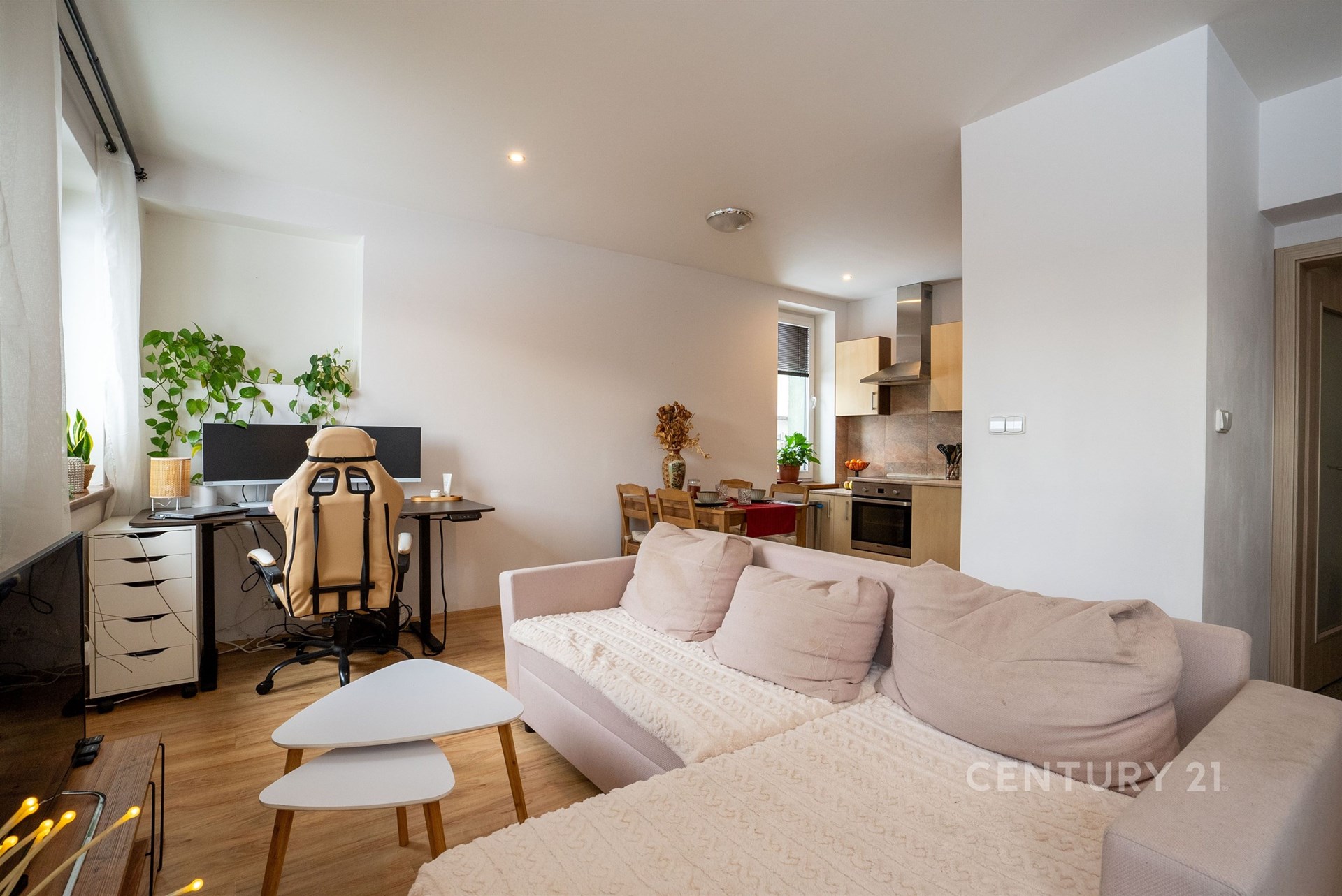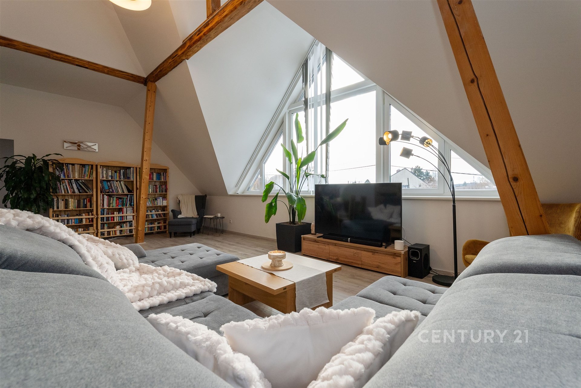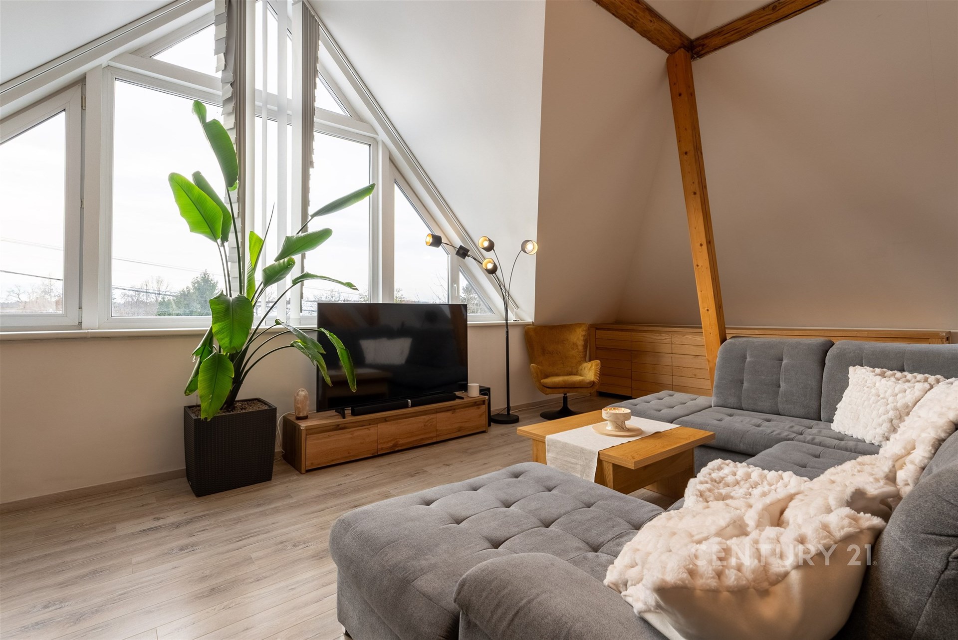 Hlavní byt se nachází v 1. NP a nabízí dispozici 3+kk s mezonetem. Dominantou je velký obývací prostor s architektonicky navrženým trojúhelníkovým oknem a vysokým stropem až 7–8 metrů. Kuchyně je v rurálním stylu s moderními spotřebiči, nechybí prádelna ani druhá toaleta. Z obývací části vede schodiště do mezonetu, kde je další ložnice s klimatizací a vestavěnými skříněmi na míru. Celý byt je vybaven kombinací podlahového vytápění a technologie Heatflow, novými trojskly a osvětlením s designovými prvky. Součástí je také inteligentní domácnost Loxone.