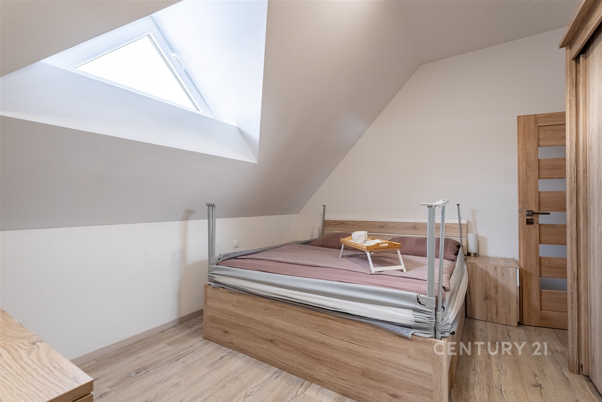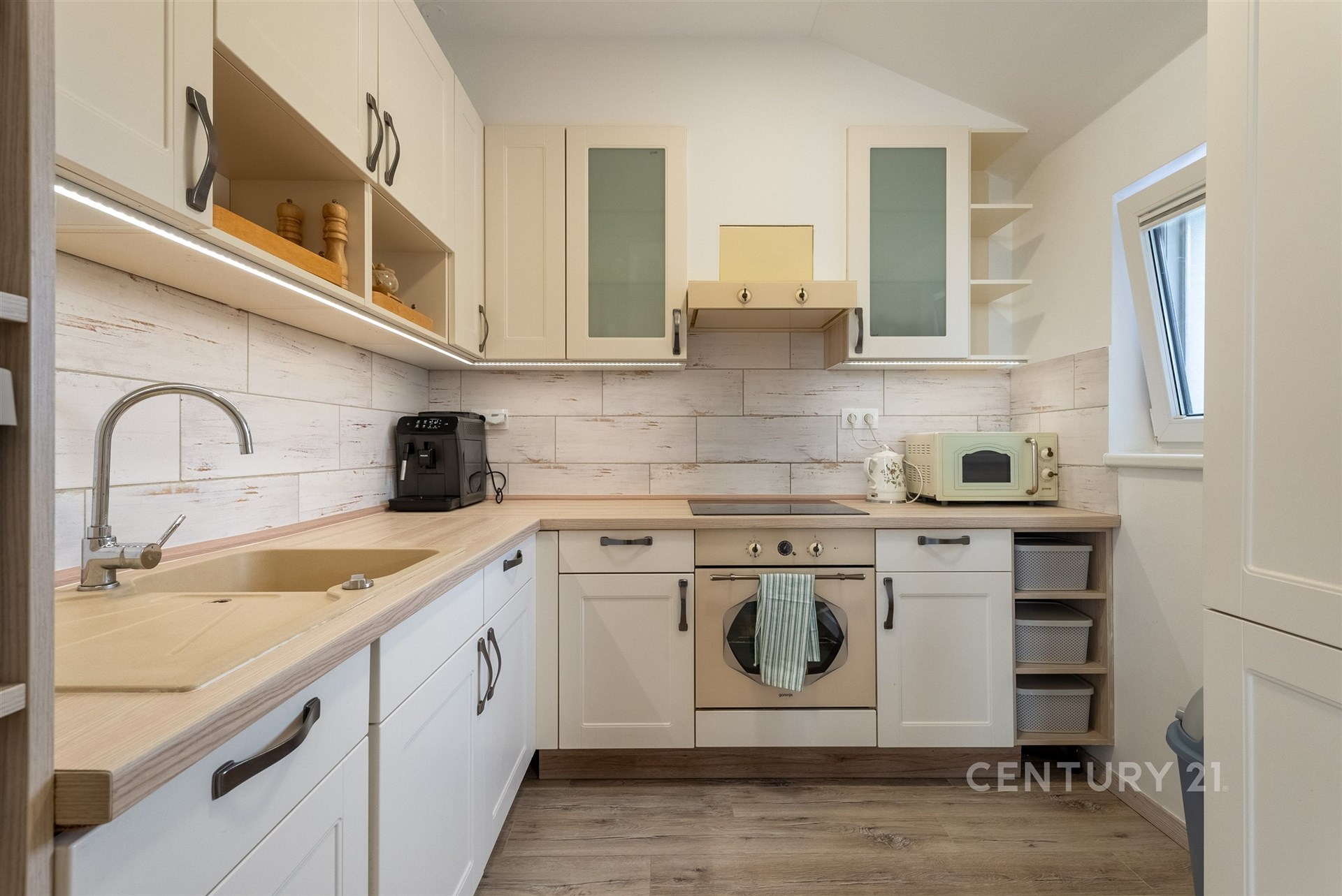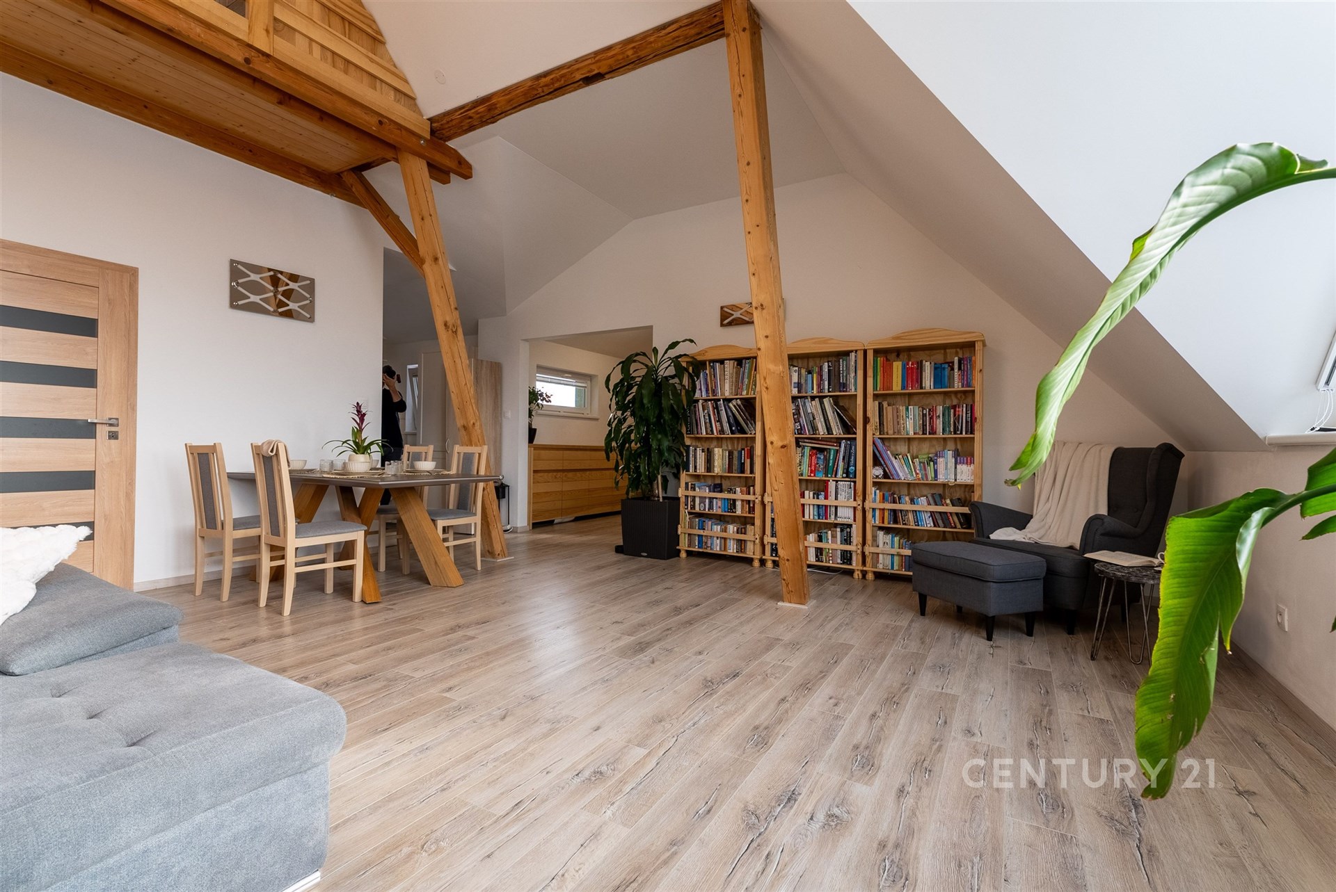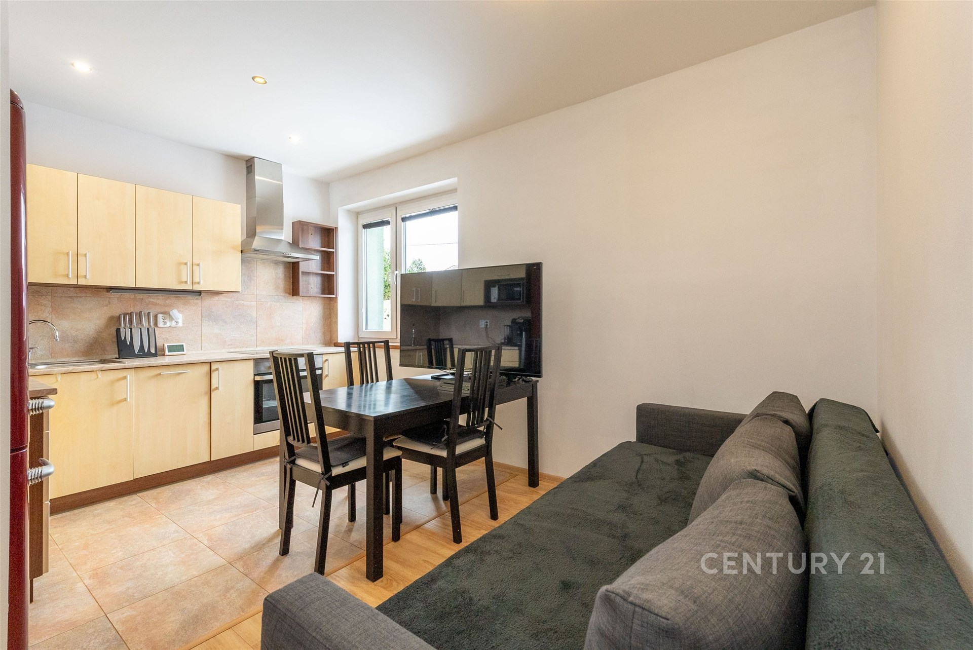 Hlavní byt se nachází v 1. NP a nabízí dispozici 3+kk s mezonetem. Dominantou je velký obývací prostor s architektonicky navrženým trojúhelníkovým oknem a vysokým stropem až 7–8 metrů. Kuchyně je v rurálním stylu s moderními spotřebiči, nechybí prádelna ani druhá toaleta. Z obývací části vede schodiště do mezonetu, kde je další ložnice s klimatizací a vestavěnými skříněmi na míru. Celý byt je vybaven kombinací podlahového vytápění a technologie Heatflow, novými trojskly a osvětlením s designovými prvky. Součástí je také inteligentní domácnost Loxone.