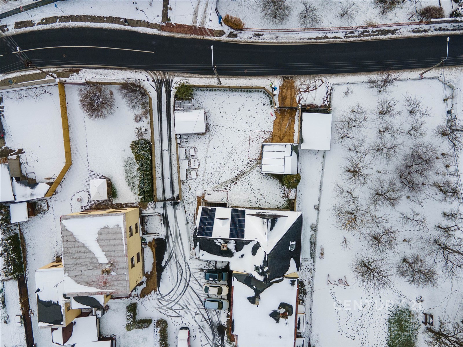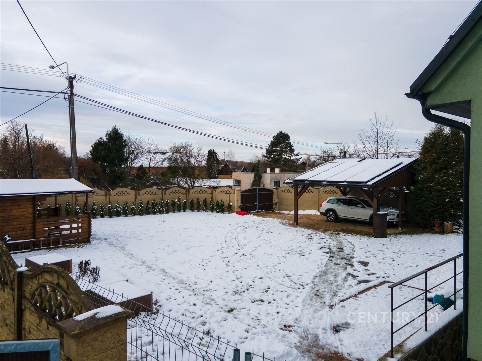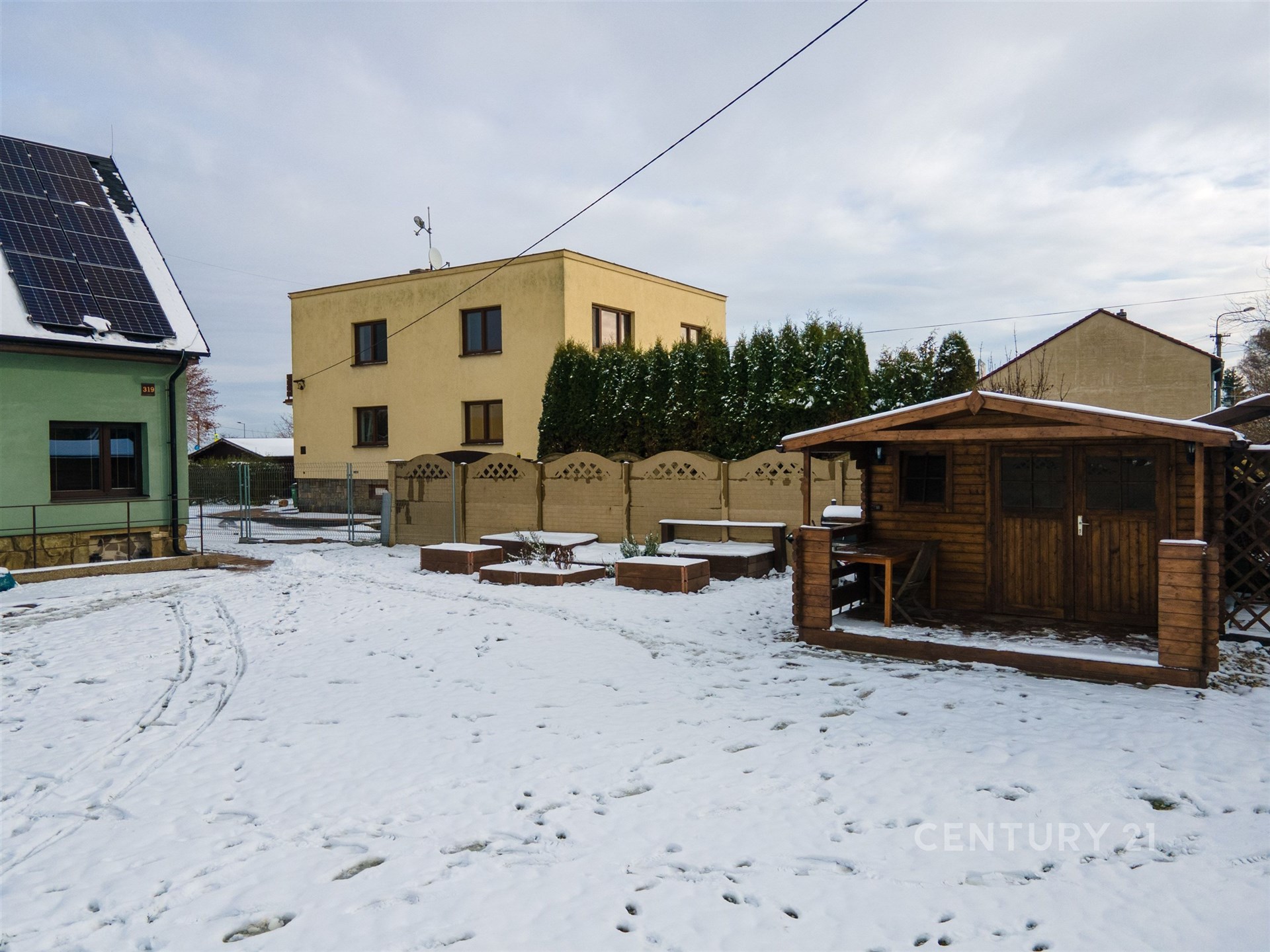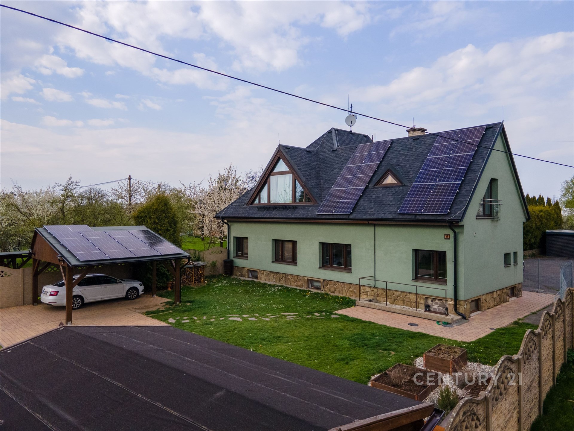 Zahrada je částečně nově oplocená a nabízí zahradní domek s elektřinou, dřevěný altán, vyvýšené záhony, dřevník a velkou pergolu pro dvě auta. Další parkovací místa jsou před bránou na čip. Pozemek je přístupný po zpevněné obecní komunikaci.
