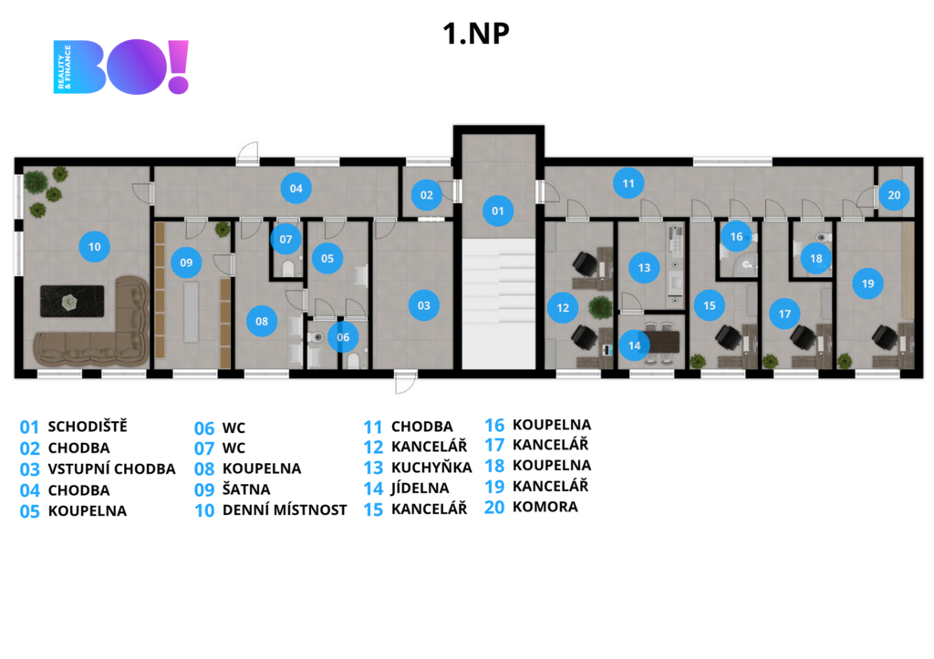 • Prostor pro Vaše nápady: Dvoupatrová cihlová budova nabízí 10 světlých kanceláří, 5 koupelen a 6 samostatných toalet – maximální komfort a pohodlí pro Vás i Váš tým.