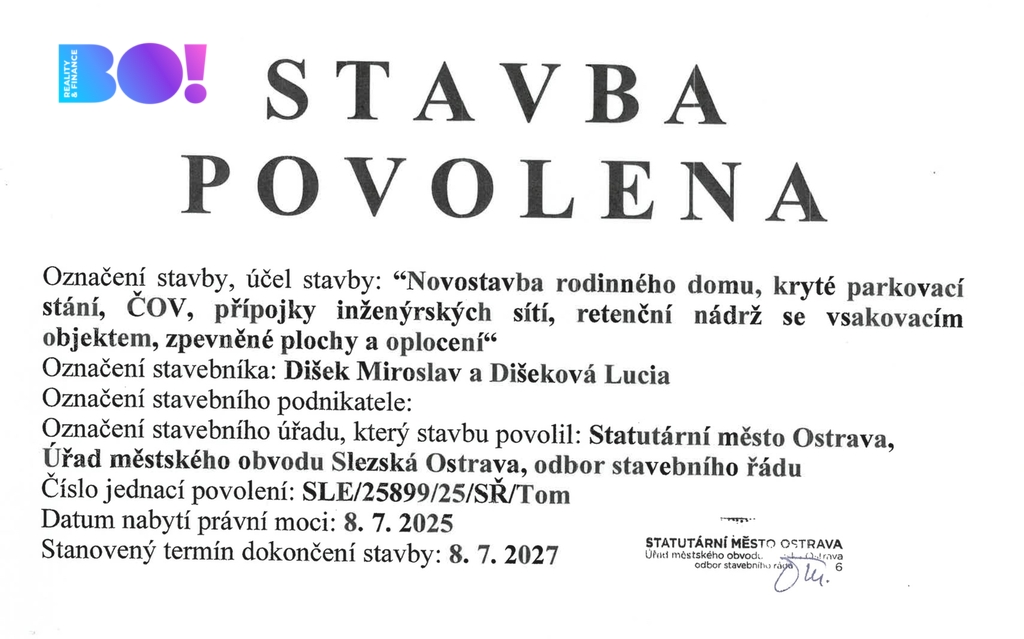 Velkým benefitem je platné stavební povolení, které novému majiteli umožní ihned zahájit výstavbu – žádné zdlouhavé vyřizování vás tedy nečeká.