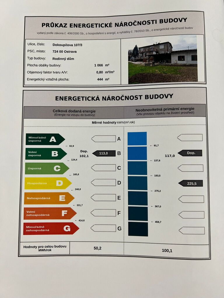 - Ukazatel energetické náročnosti budovy: 113 kWh/m²