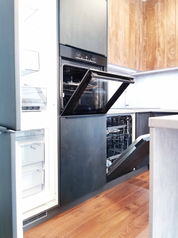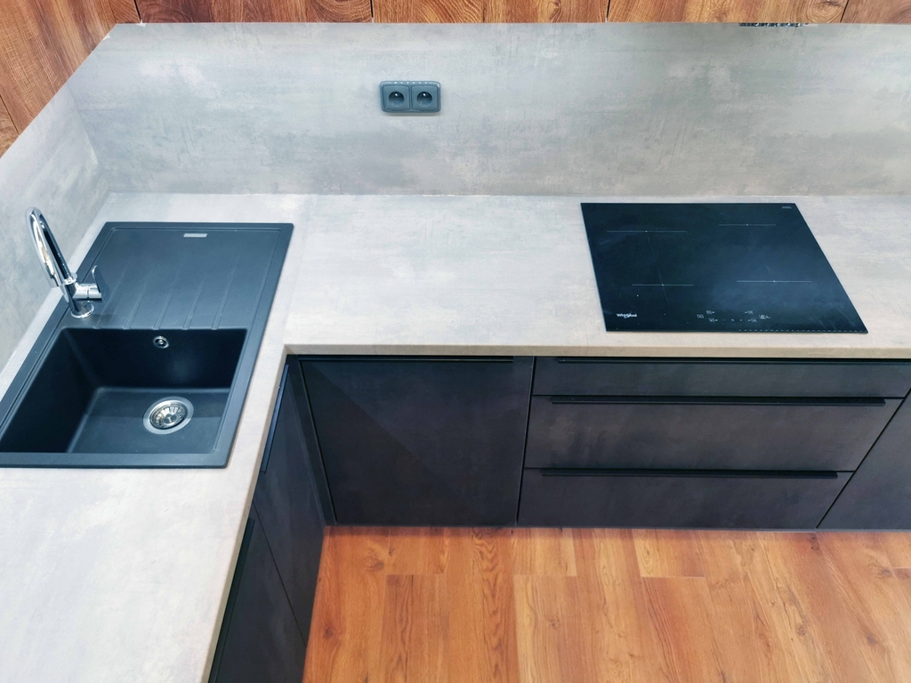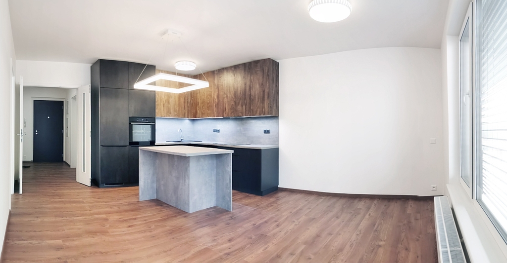- k dispozici kuchyňská linka se spotřebiči (vestavěná lednice, mrazák, trouba, indukční deska, myčka), venkovní elektricky ovládané žaluzie