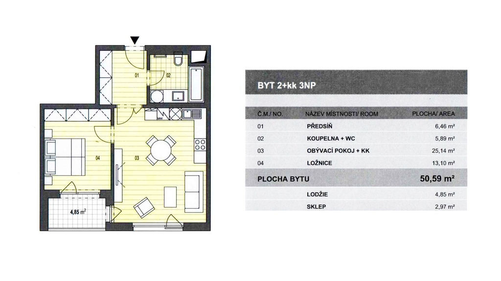 - celková výměra bytu 50,59 m2 + lodžie 4,85 m2 + sklep 2,97 m2