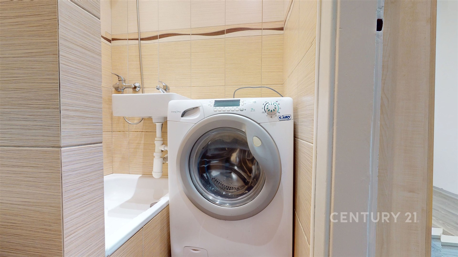 Koupelna je spojena s toaletou a najdete v ní nejen hezké kachličky, ale i pračku, která je součástí vybavení.