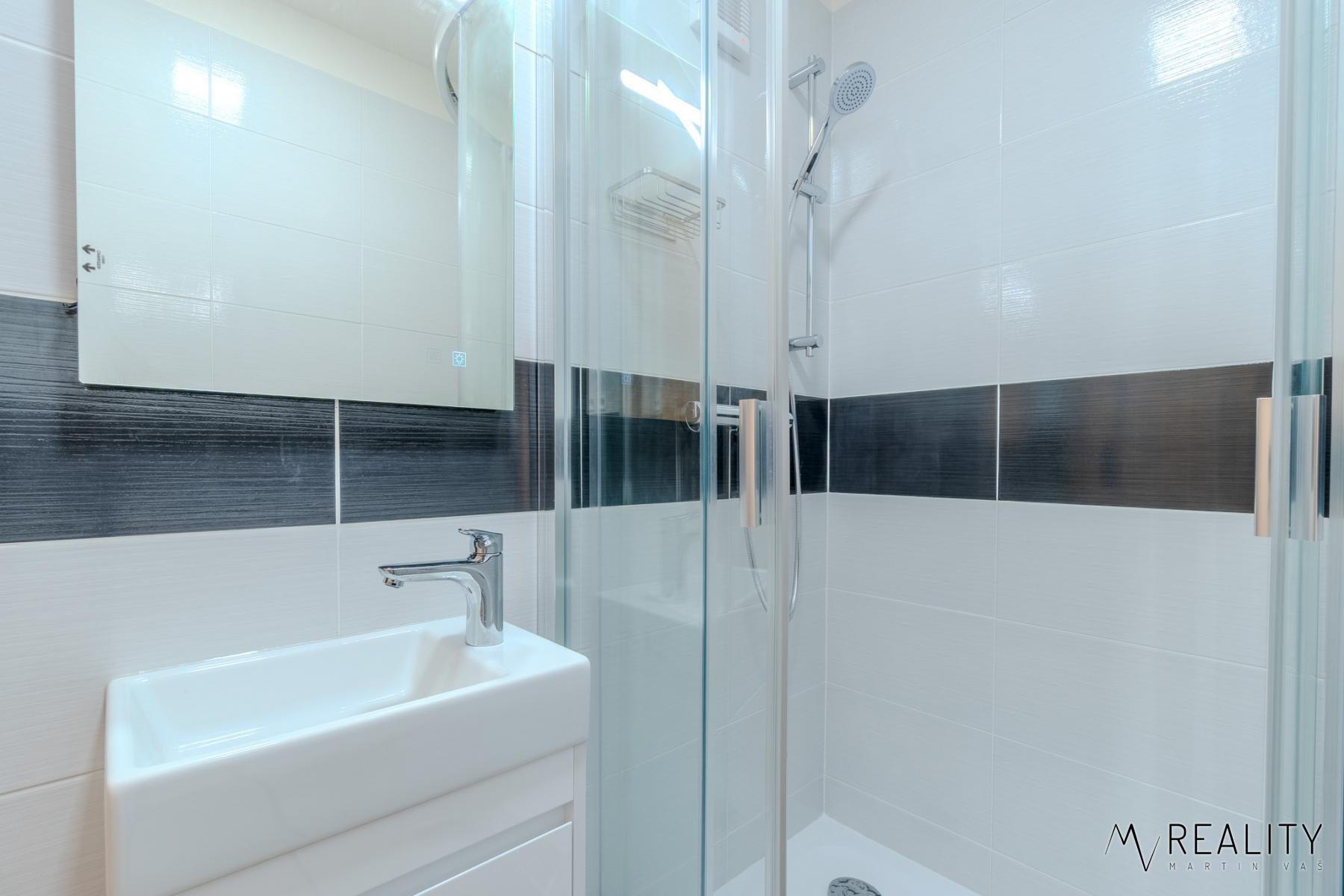 Koupelna je zcela nová, vybavená sprchovacím koutem, umyvadlem s koupelnovou skříňkou, osvětleným zrcadlem a nechybí zde ani přípojka na pračku.