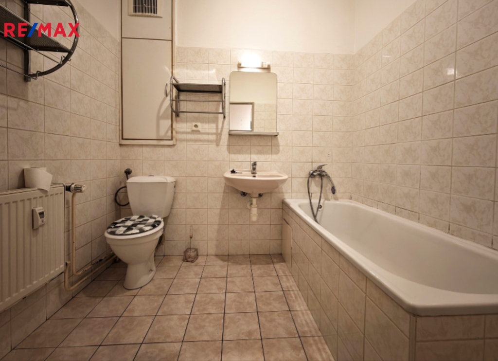 Pokoj s kuchyňským koutem, předsíň, prostorná koupelna s vanou + WC.