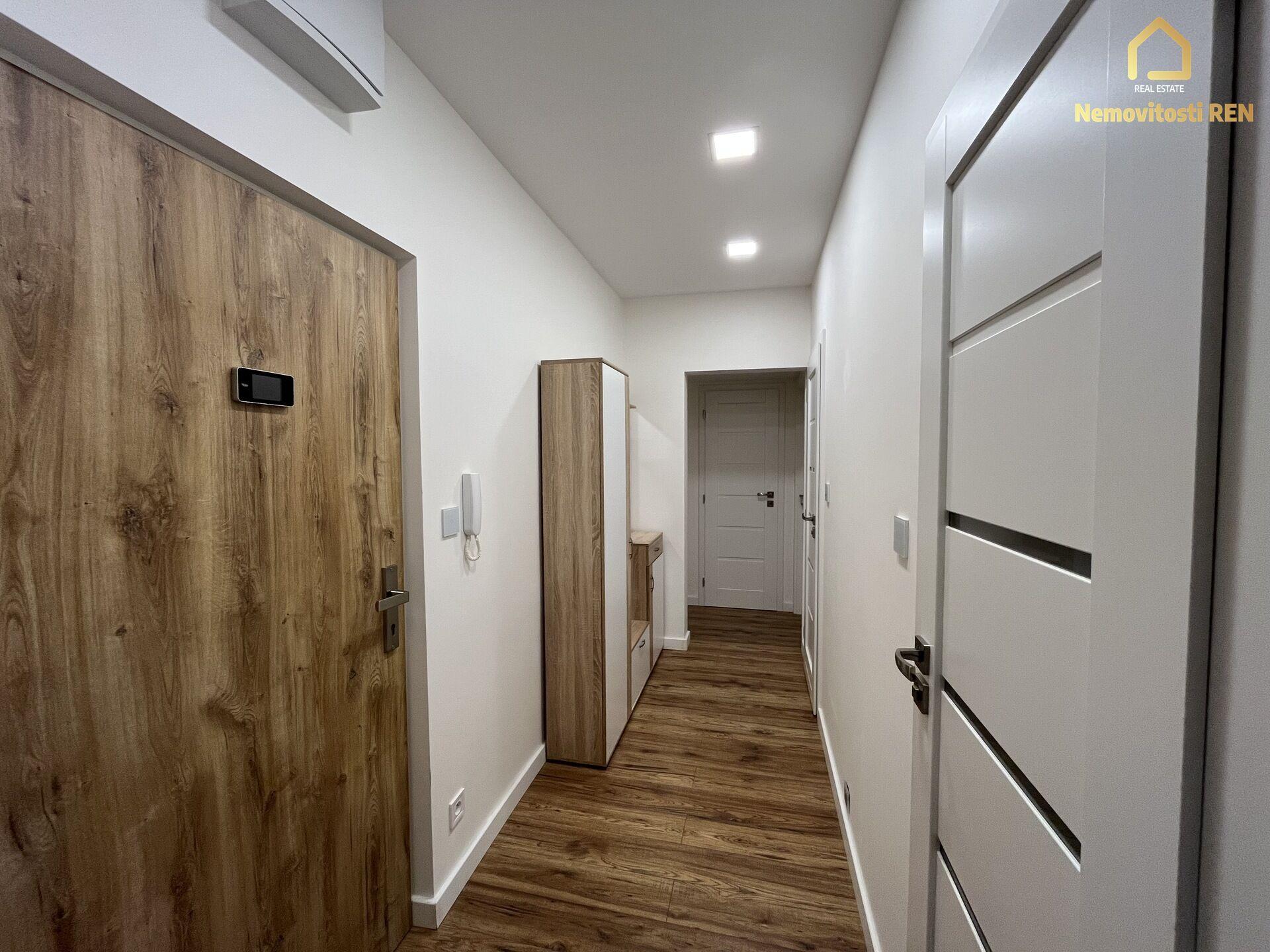 Dispozičně je byt řešen obývacím pokojem s francouzským oknem a vstupem do kuchyně, která je vybavena moderní kuchyňskou linkou v bílé barvě v kombinaci s dekorem dřeva a k dispozici jsou vestavěné spotřebiče: lednice, horkovzdušná trouba, mikrovlnná trouba, indukční varná deska, myčka nádobí a odsavač par.